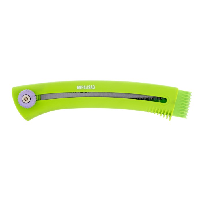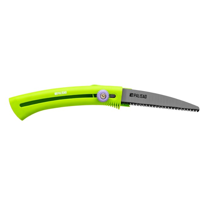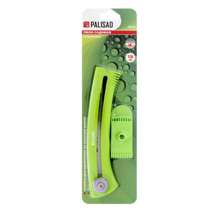 Выдвижная садовая пила Palisad 60410 с рабочей частью длиной 150 мм, с пластиковой рукояткой, предназначена для продольного и поперечного распила древесины и обрезки веток. Благодаря выдвижной конструкции пила легко помещается в сумке и даже кармане, поэтому ее удобно брать в поход. Инструмент будет полезен строителям, садоводам и туристам. ПреимуществаПрочность и коррозионная стойкость — рукоятка изготовлена из нейлона, полотно выполнено из рессорно-пружинной стали и покрыто лаком.Эффективная обрезка живых ветвей — лезвие с мелким шагом зубьев TPI 9-10 обеспечивает чистый и ровный рез, минимизируя потери сока растением.Высокая производительность — разведенные зубья закалены до необходимой твердости и имеют трехгранную заточку, что значительно облегчает распиловку.Удобное использование — винтовой фиксатор позволяет закрепить лезвие на любой длине до 150 мм.Эргономичность — рукоятка удобно ложится в руку, а также служит ножнами для полотна.Продуманная транспортировка — в рукоятке имеется отверстие для дополнительного подвеса, позволяющего закрепить инструмент на поясном ремне.