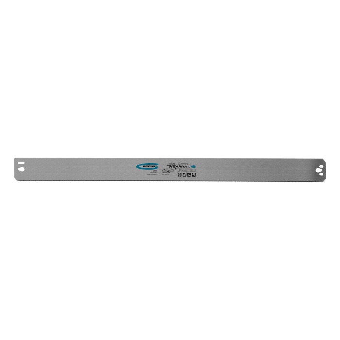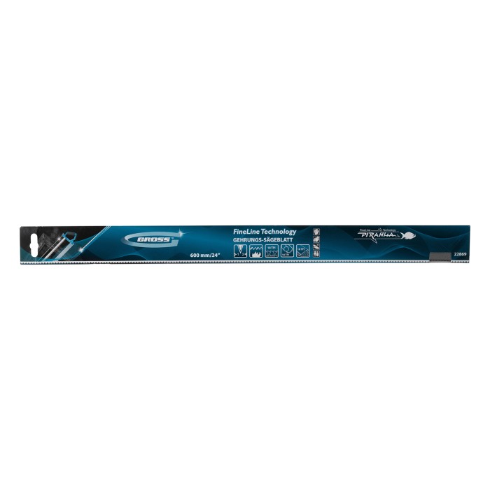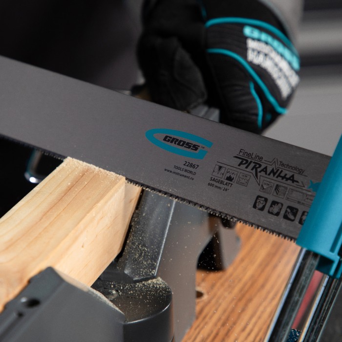 Пильное полотно Gross «PIRANHA» 22869 длиной 600 мм, с каленым зубом с 2D-заточкой, 18 TPI — режущий элемент для прецизионного стусла, применяемый для распила под углом заготовок из дерева, мягкого металла и пластика. Ме...