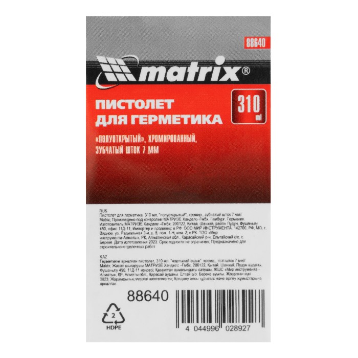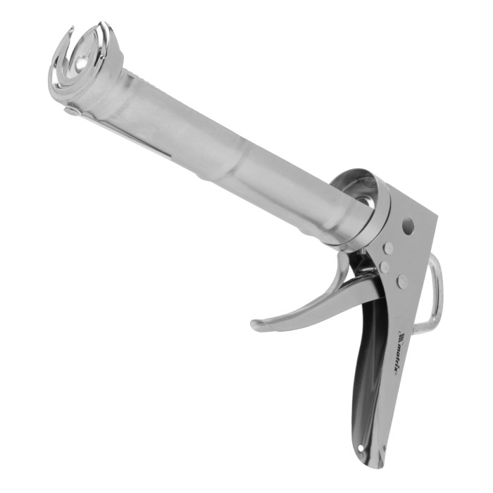 Хромированный пистолет для герметика Matrix 88640 полуоткрытого типа, с зубчатым штоком диаметром 7 мм, предназначен для установки стандартной тубы с клеем или герметиком объемом 310 мл. Зубчатый шток позволяет точно дозировать и аккуратно наносить смесь. Пистолет пригодится строителям, сантехникам и мастерам по ремонту, а также будет полезен в быту.ПреимуществаПрочность и долговечность — корпус с 3 поперечными ребрами жесткости не перекашивается, хромовое покрытие обеспечивает защиту от коррозии.Простая конструкция — установка или замена тубы занимает несколько секунд.Удобная обрезка насадки картриджа — на корпусе имеется специальное отверстие с заточенными краями.Быстрая очистка насадки от засохших остатков смеси — в комплект поставки входит специальная игла.Малый вес 442 г — работа с инструментом не вызывает ощущение усталости