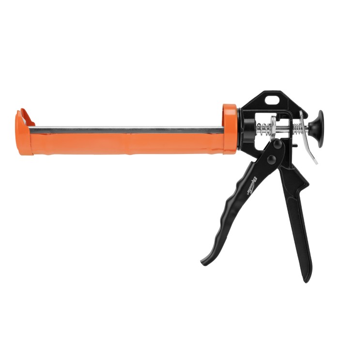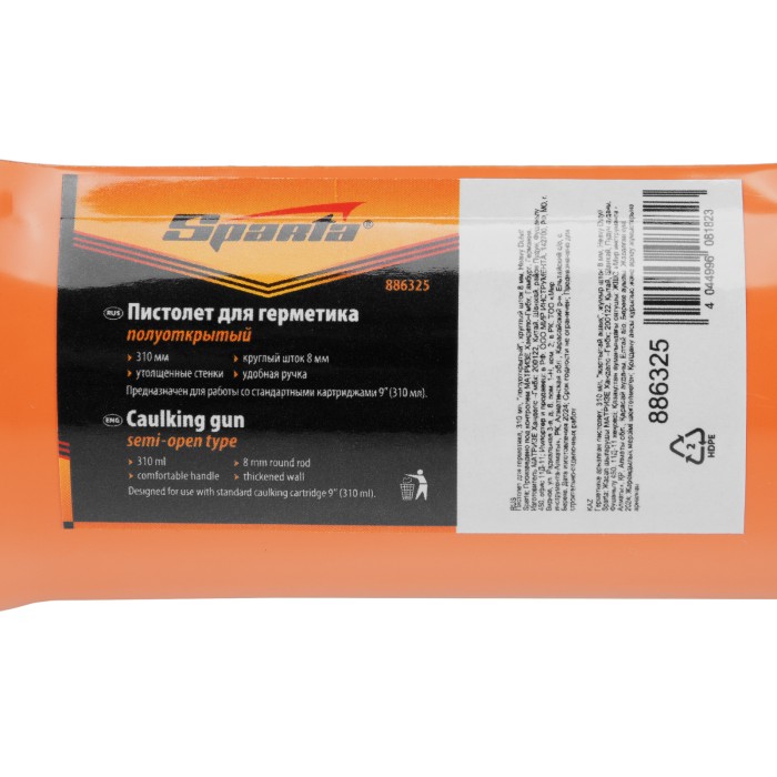 Пистолет для герметика Sparta Heavy Duty 886325 полуоткрытого типа, с круглым штоком диаметром 8 мм, совместим с тубами емкостью 310 мл и позволяет точно дозировать и равномерно наносить требуемое количество состава. Усиленный ребрами жесткости корпус не перекашивается, ход штока остается плавным. Благодаря функции защиты от протекания герметик не расходуется впустую. Инструмент используют для соединения деталей, заполнения пустот и герметизации швов. Будет полезен строителям, сантехникам, а также пригодится в быту.ПреимуществаПрочность и долговечность — корпус изготовлен из инструментальной стали и имеет литую рукоятку.Эргономичность — рукоятка удобно ложится в руку, поворотная муфта упрощает использование инструмента.Комфортная работа без ощущения усталости — благодаря полуоткрытому корпусу вес пистолета снижен.