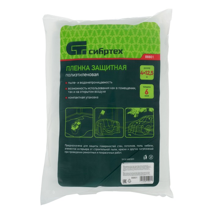 Защитная полиэтиленовая пленка Сибртех 88801 плотностью 6 мкм и размером 4 х 12,5 м используется для защиты предметов и поверхностей, на которые может попасть пыль или мусор в процессе ремонтно-строительных работ. С ее п...
