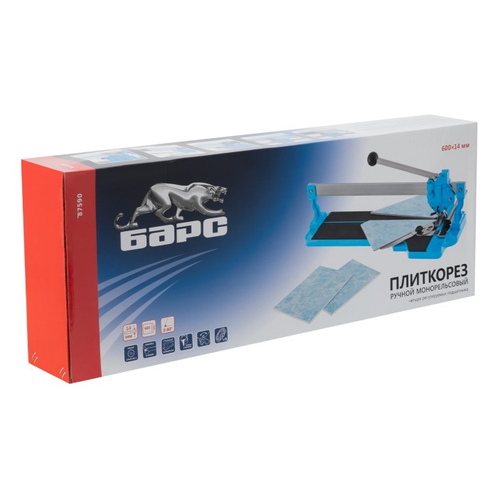 Ручной монорельсовый плиткорез Барс 87590 с ходовой кареткой, с 4 регулируемыми подшипниками из 9 и литой станиной, применяется для резки плитки размером до 600 х 14 мм. Плиткорез оснащен усиленным стальным монорельсом и опорами. Мощный разделитель позволяет эффективно резать любую плитку: керамическую и керамогранитную.ПреимуществаВысокое качество выполняемых работ — ходовая каретка с 9 подшипниками (4 регулируемых) перемещается по рельсу свободно и плавно, режущий ролик из твердого сплава ВК-8 мягко и ровно режет материалы.Прочная и устойчивая конструкция — инструмент имеет литую станину из магниевого сплава.Удобная эксплуатация — конструкция плиткореза позволяет производить разлом в любой точке поверхности плитки.Резка плитки под углом до 60° — производитель предусмотрел металлическую линейку с угломером.Быстрая смена режимов работы — специальный переключатель позволяет переводить ролик из положения резки в положение плитколома.Надежная фиксация плитки — амортизирующие накладки не дают ей смещаться во время реза.