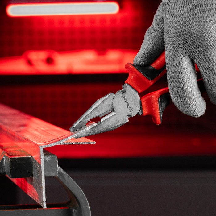 Никелированные плоскогубцы Matrix NICKEL 16904 длиной 180 мм, с двухкомпонентными рукоятками, предназначены для выполнения ремонтных и монтажных работ. Губки с насечками крепко удерживают детали разной формы, крепеж, проволоку или провода. Режущие кромки позволяют перекусывать проволоку. Плоскогубцы используются в профессиональной и бытовой сфере.ПреимуществаПрочность и износостойкость — инструмент изготовлен из стали 45.Эффективность — рабочие кромки прошли закалку до 53 HRC, поэтому справляются с твердой проволокой без потери режущих свойств.Возможность работать с плоскими и круглыми деталями — губки имеют 2 зоны захвата.Долговечность — никелированные рабочие поверхности не подвержены коррозии.Комфортная и безопасная работа — двухкомпонентные рукоятки не скользят в руке и имеют специальные упоры для пальцев.