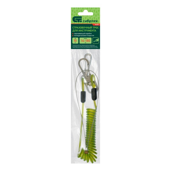 Подвес для инструмента Сибртех 90281 со стальным сердечником, нержавеющими застежкой и кольцом, предотвращает падение инструмента весом до 10 кг во время выполнения работ на высоте. Растягивается до 140 см, поэтому даже на вытянутой руке с инструментом комфортно работать. Пригодится на строительной площадке.ПреимуществаПрочность и долговечность — сердечник изготовлен из стали, полиуретановая оплетка защищает витки от деформации.Надежное крепление к скобе или крюку — производитель предусмотрел стальные карабины и кольцо.Высокий ресурс — кольцо и карабины устойчивы к коррозии и выдерживают длительное использование.