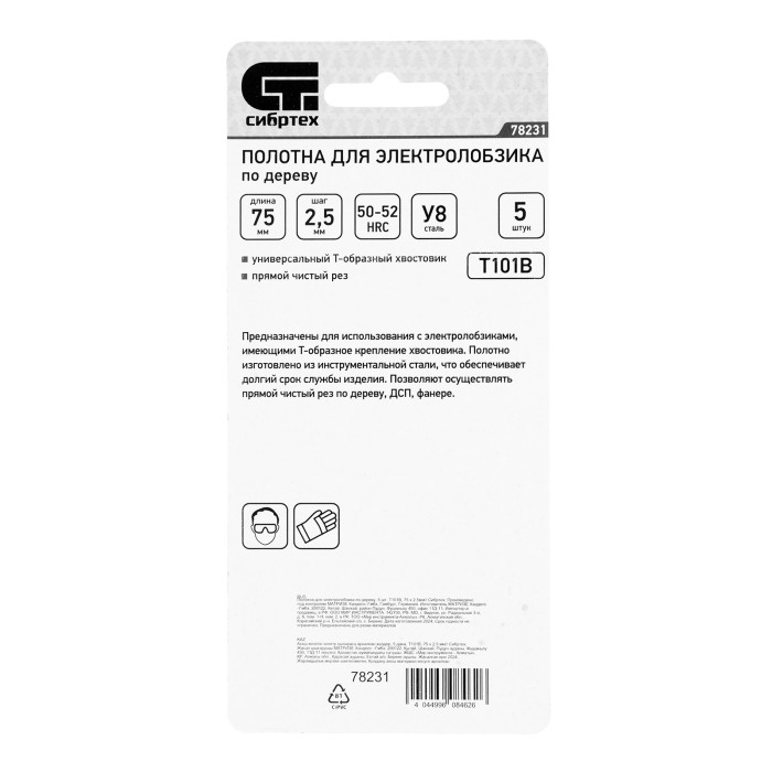 Полотна для электролобзика по дереву, 5 шт, T101B, 75 х 2.5 мм Сибртех
