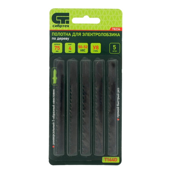 Полотна по дереву Сибртех 78234, 5 шт. T144D, 75 х 4мм, устанавливаются на электролобзики в качестве режущего элемента. Они помогают произвести быстрый рез деревянных конструкций. Полотна пригодятся мастерам при выполнении бытовых ремонтных работ.ПреимуществаПрочность и износостойкость — полотна изготовлены из высокоуглеродистой стали У8 и закалены до твердости 48-52 HRC.Шаг зубьев 4 мм — полотна обеспечивают точный и быстрый рез материалов.Удобная упаковка — индивидуальные кармашки для каждого изделия позволяют с удобством хранить набор и предотвращает образование коррозии.5 штук в упаковке — набора хватит надолго.