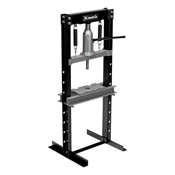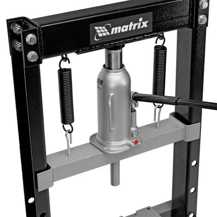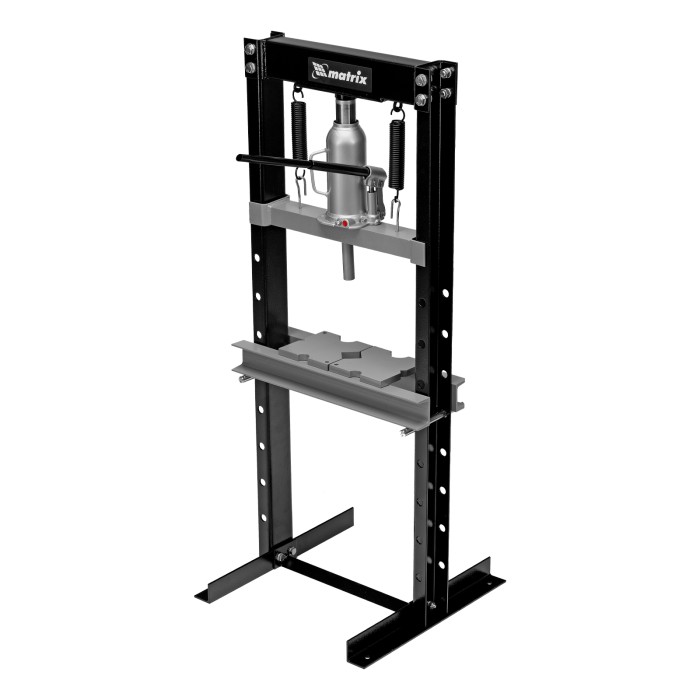 Гидравлический пресс Matrix 523105 размером 1360 х 500 х 510 мм, воздействующий на детали с усилием 12 т, поставляется комплектом из 2 частей. Используется для запрессовки и выпрессовки различных деталей, необходимых для ремонта автомобилей. Изготовлен из толстого прочного металла и имеет простую разборную конструкцию из верхней и нижней балок, стоек, станин и гидравлического бутылочного домкрата. Пресс подойдет для самостоятельного использования в гараже.ПреимуществаУдобная работа с деталями различного размера — высота подъема рабочего стола регулируется.Эффективное решение широкого спектра задач — опорные пластины позволяют фиксировать предметы разной формы.Комфортная эксплуатация — после спуска давления шток самостоятельно возвращается в исходное положение.