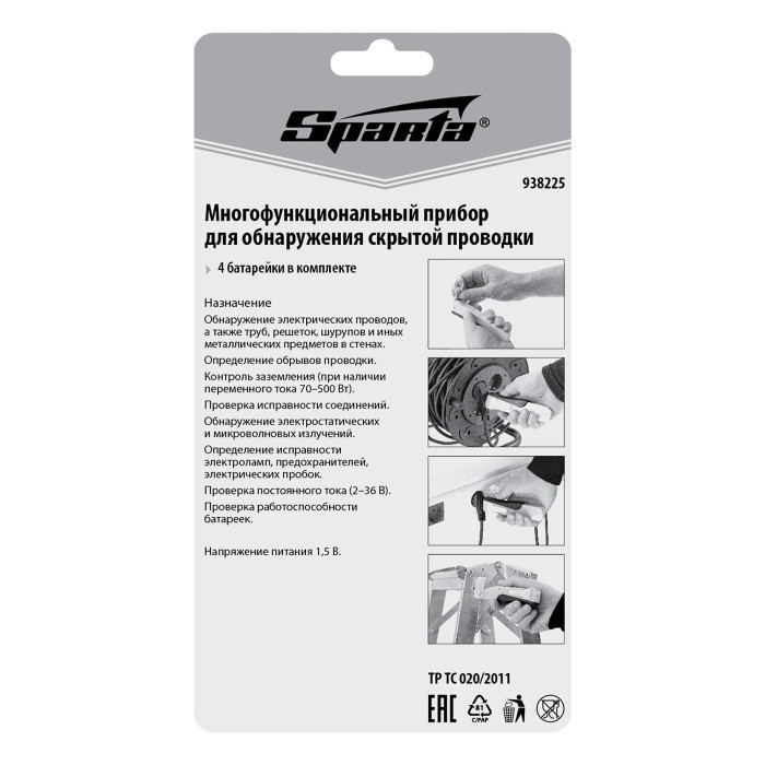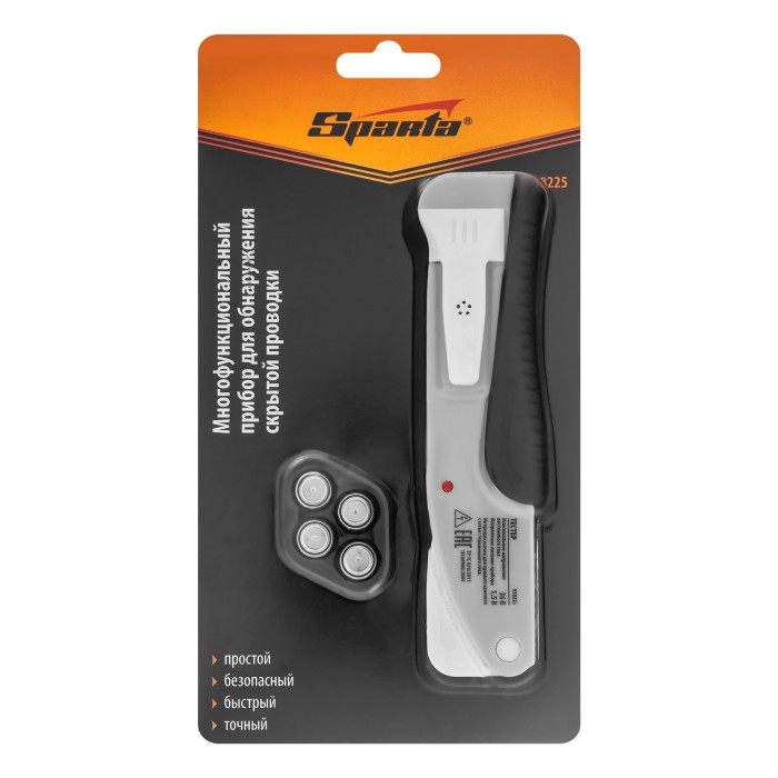 Прибор Sparta 938225 используется для обнаружения скрытой проводки и предметов из металла: труб, решеток, крепежных элементов и т.д. Он пригодится мастерам при сверлении стен, установке розеток, прокладке коммуникаций и других ремонтных работах. Также с его помощью можно определить исправность проводки, приборов, полярность батареек, осуществить контроль заземления и проверить наличие микроволновых и электростатических излучений.ПреимуществаПростое управление позволяет использовать прибор начинающим мастерам.Корпус выполнен из прочной пластмассы, что обеспечивает высокий ресурс прибора.Для удобства работы прибор имеет как звуковой, так и световой индикаторы.Высокий контроль качества прибора гарантирует его надежность и соответствие европейским стандартам безопасности.Прибор легко поместится в карман за счет небольшой длины 210 мм и малого веса 121 г.