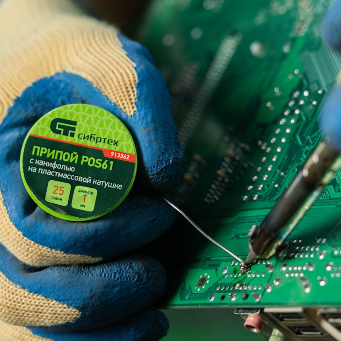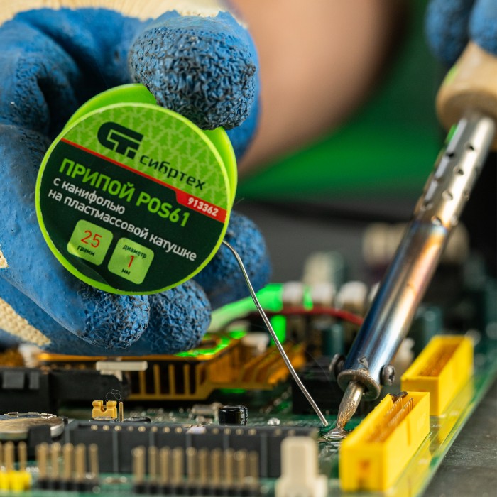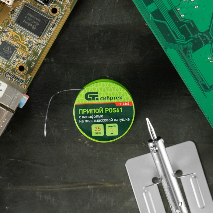 Припой с канифолью POS61 Сибртех 913362 диаметром 1 мм и весом 25 г, на пластмассовой катушке, используется для пайки. Надежно соединяет медные провода, позволяет монтировать транзисторы, предохранители на печатной плате, а также работать с другими легкоплавкими металлическими деталями. Пригодится радиолюбителям и мастерам по ремонту электроники.ПреимуществаЭффективность — припой с канифолью ПОС-61 не требует отдельной обработки деталей флюсом.Пайка чувствительных к перегреву компонентов — благодаря высокому содержанию олова (Sn61% + Pb39%, 61% олова + 39% свинца) припой плавится при температуре 190 ℃.Удобное дозирование — паяльный припой поставляется в виде намотанной на катушку проволоки.