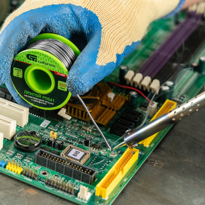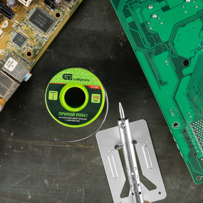 Припой с канифолью, D 2 мм, 100 г, POS61, на пластмассовой катушке Сибртех