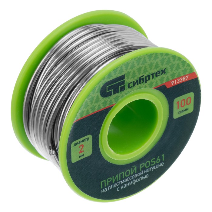 Припой с канифолью POS61 Сибртех 913387 диаметром 2 мм и весом 100 г, на пластмассовой катушке, — сплав, использующийся для пайки электронных деталей и проводов. Будет полезен для монтажа и ремонта электронной техники в ...