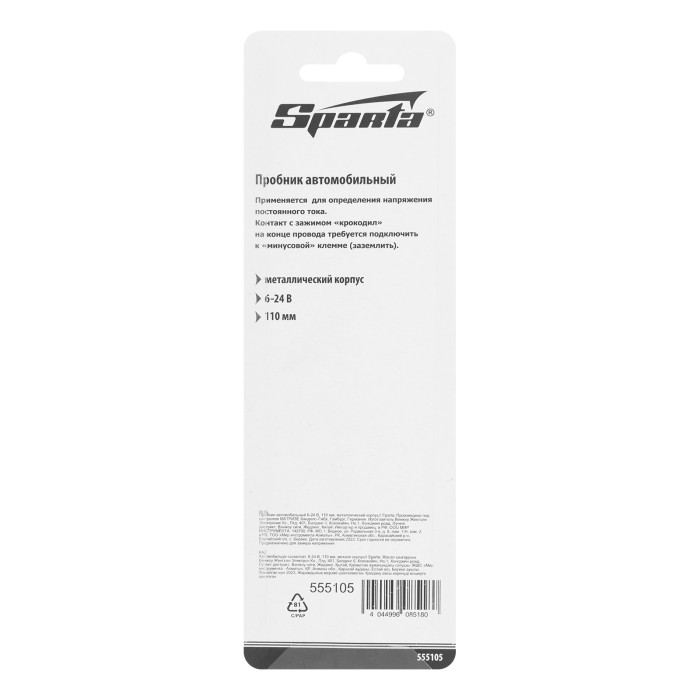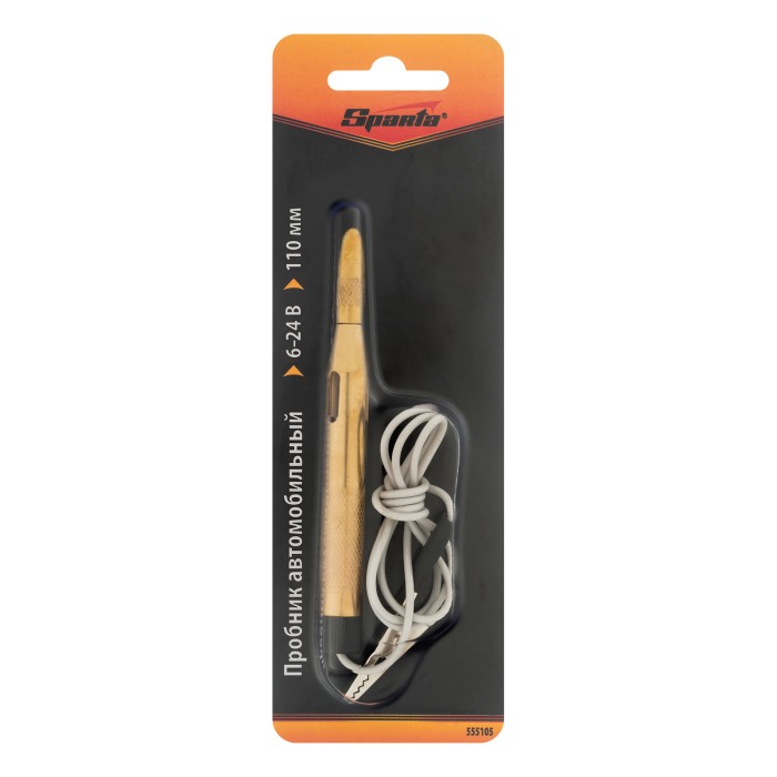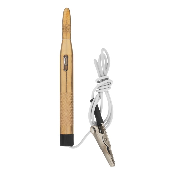 Автомобильный пробник Sparta 555105 длиной 110 мм, с металлическим корпусом, определяет напряжение постоянного тока в диапазоне 6-24 В. Пригодится на станциях техобслуживания и автовладельцам при ремонте транспортных средств, монтаже электрооборудования и проверке свечей зажигания.ПреимуществаКорпус и контактная игла пробника выполнены из латуни, что гарантирует его надежность и стойкость к коррозии.Инструмент прост в применении, достаточно подключить контакт «крокодил» к корпусу автомобиля, а иглу — к детали.Световой индикатор значительно упрощает проведение работ.Тестер-пробник легко поместится в бардачок автомобиля или в рабочую сумку.