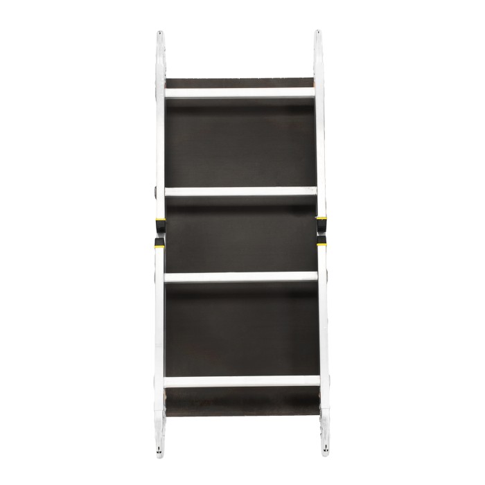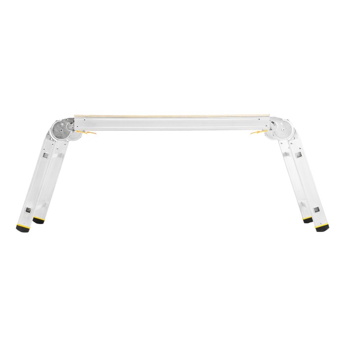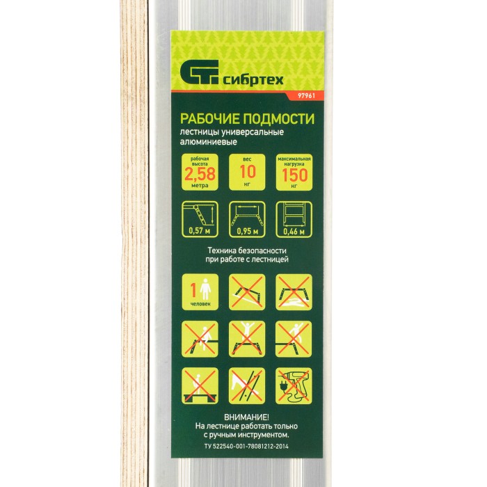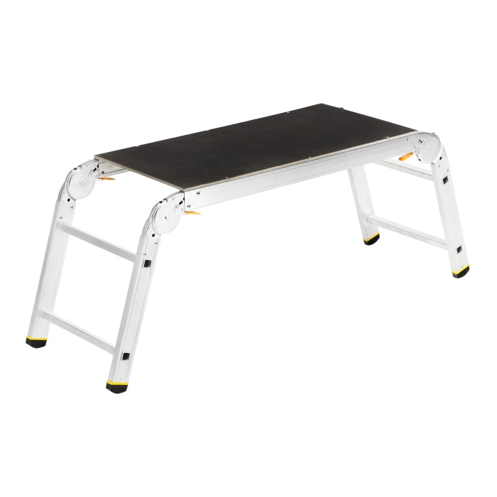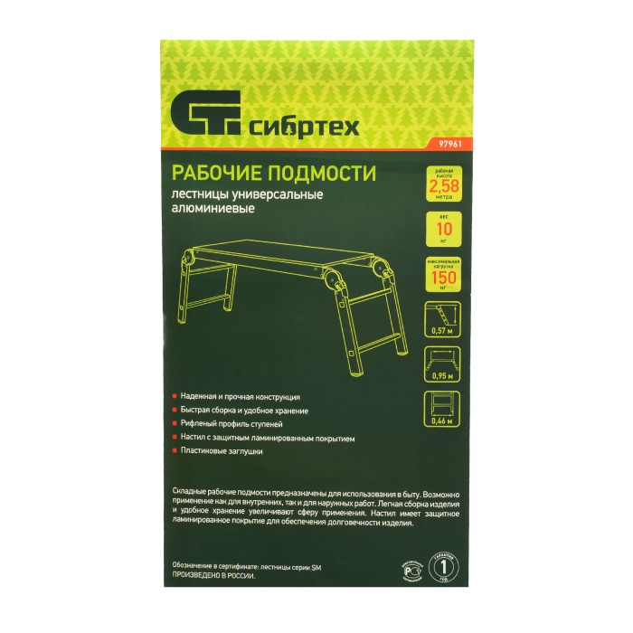 Рабочие подмости 97961, количество ступеней 2 х 4 х 2, используют для размещения инструментов и материалов, а также для работы на высоте. Рассчитаны на нагрузку до 150 кг, используются во время строительства и ремонта.ПреимуществаНадежность — стойки и ступени изготовлены из прессованного алюминиевого профиля, рабочая площадка из антисептированной фанеры устойчива к воздействию микроорганизмов и насекомых.Увеличенная прочность — стойки усилены в местах наибольшей нагрузки, многократная развальцовка обеспечивает надежное соединение ступеней со стойками.Простая установка — подмости быстро устанавливаются и складываются, шарнирные замки легко регулируются и автоматически фиксируются.Безопасность — ступени имеют антискользящую рифленую поверхность, а благодаря пластиковым накладкам на стойках подмости не скользят во время работы.Удобное хранение и транспортировка — габариты в сложенном состоянии составляют 1,16 х 0,15 х 0,48 м.