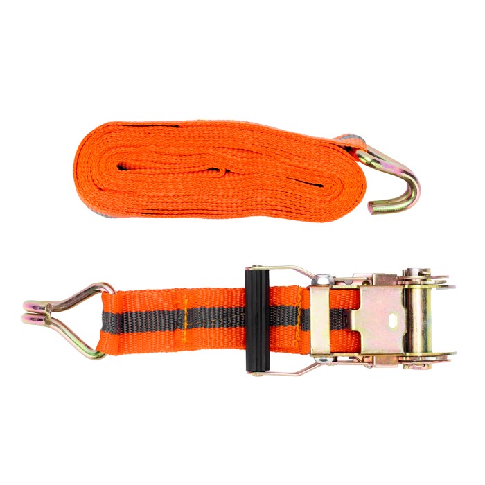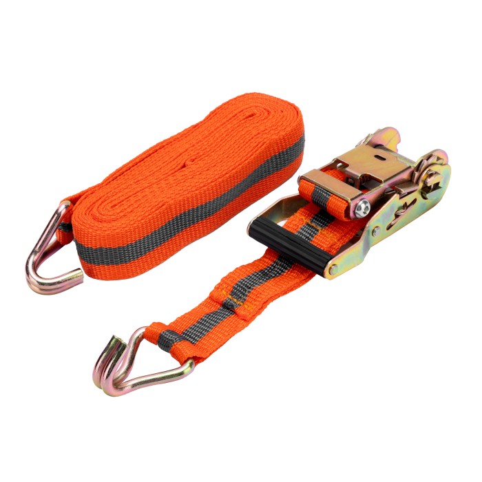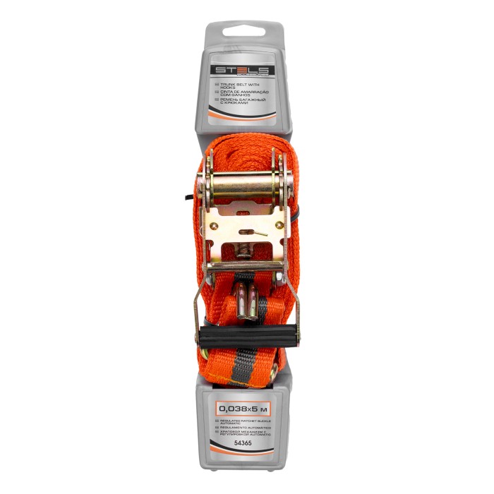 Багажный ремень с крюками Stels 54365 размером 0,038 х 5 м, с храповым механизмом Automatic, помогает закрепить груз в открытом багажнике на крыше легковой автомашины или в прицепе. Пригодится для транспортировки различных предметов.ПреимуществаИзносостойкость — ремень изготовлен из прочного полиэстера, крюки из углеродистой стали устойчивы к коррозии.Надежная фиксация груза во время движения и маневров автомобиля — допустимая разрывная нагрузка составляет 700 кг, стальные крюки крепко удерживают натянутый ремень.Удобная эксплуатация — храповой механизм Automatic обеспечивает быстрое и надежное затягивание ленты.
