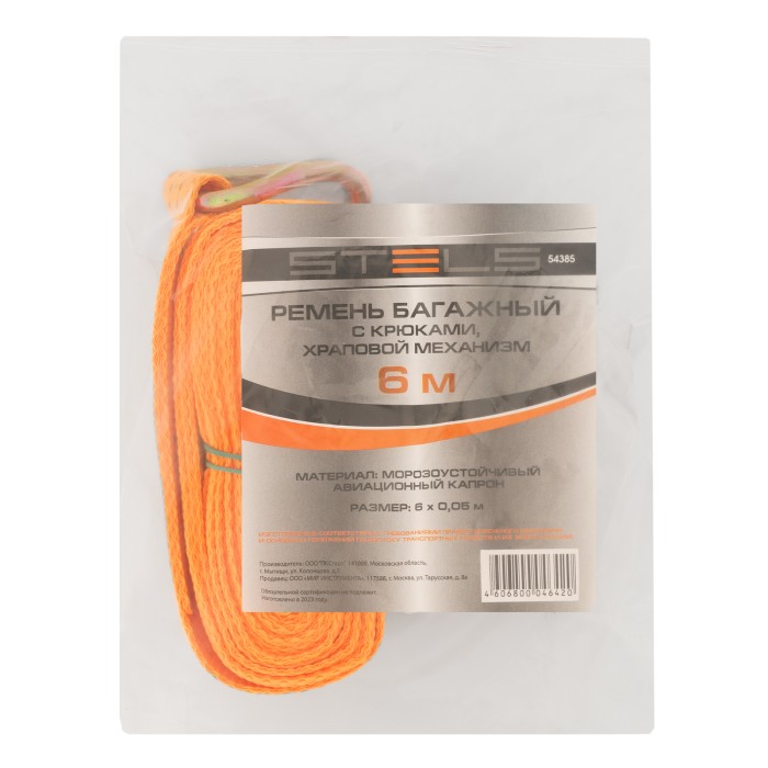 Багажный ремень с крюками Stels 54385 шириной 5 см и длиной 6 м, с храповым механизмом, предназначен для фиксации грузов на решетчатых конструкциях, например, открытых автомобильных багажниках, а также в прицепах. Пригодится для транспортировки различных предметов.ПреимуществаИзносостойкость — ремень изготовлен из прочного и морозостойкого полипропилена, крюки из углеродистой стали устойчивы к деформации.Надежная фиксация груза во время движения и маневров автомобиля — допустимая разрывная нагрузка составляет 800 кг, стальные крюки крепко удерживают натянутый ремень.Комфортное и быстрое затягивание ленты — ремень снабжен храповым механизмом.Удобное хранение — ремень весит 1,069 кг и в сложенном виде очень компактен.