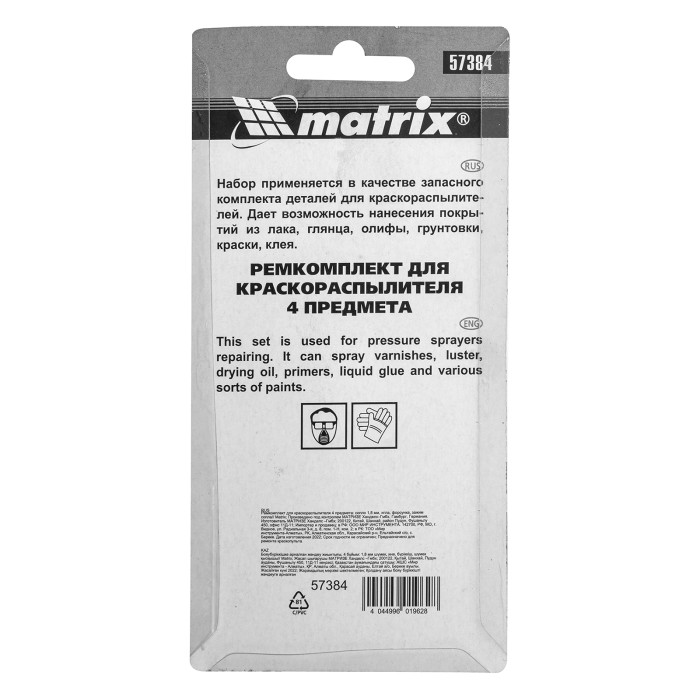 Ремкомплект Matrix 57384 предназначен для замены деталей на краскораспылителях Matrix 57314, 57315, 57316, 57317 и состоит из 4 предметов: сопла диаметром 1,8 мм, иглы, форсунки, зажима. Сопло, надежно фиксируемое зажимом, позволяет работать с эпоксидными и полиуретановыми красками, а также шпаклевками. ПреимуществаНадежность — все предметы в наборе выполнены из стали и устойчивы к воздействию сжатого воздуха.Управление подачей краски — игла позволяет мгновенно открывать и закрывать сопло.Диаметр форсунки 33 мм — подача узкой струи раствора удобна для окрашивания небольших деталей.