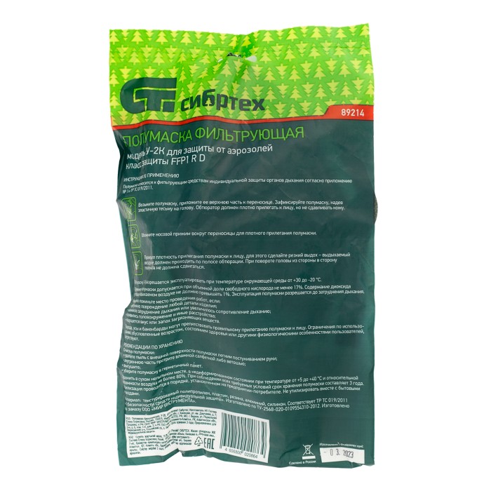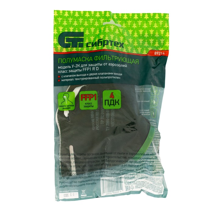 Фильтрующая полумаска Сибртех У-2К 89214 из текстурированного полипропилена, класс защиты FFP1, закрывает нос и рот для изоляции дыхательной системы от воздействия вредных веществ. Она предотвращает попадание крупных частиц нетоксичной промышленной пыли. Будет полезна в ходе строительных, отделочных и иных работ, где есть риск распространения вредных частиц.ПреимуществаНадежность — полумаска выполнена из текстурированного полипропилена и дополнена слоем полимерного материала с внутренней стороны.Облегченное дыхание — благодаря клапану выдоха обеспечивается отвод тепла и влаги.Маска имеет маркировку R D — подходит для многоразового использования и удовлетворяет требованиям по устойчивости к запылению.Универсальность — изделие можно использовать в условиях повышенной влажности и перепадов температуры.Плотная фиксация на лице — имеется крепление из эластичной тесьмы и носовой зажим.Складная полумаска — она не деформируется при транспортировке и хранении.Подтвержденное качество — полумаска имеет сертификат соответствия требованиям ТР ТС 019/2011 «О безопасности средств индивидуальной защиты».