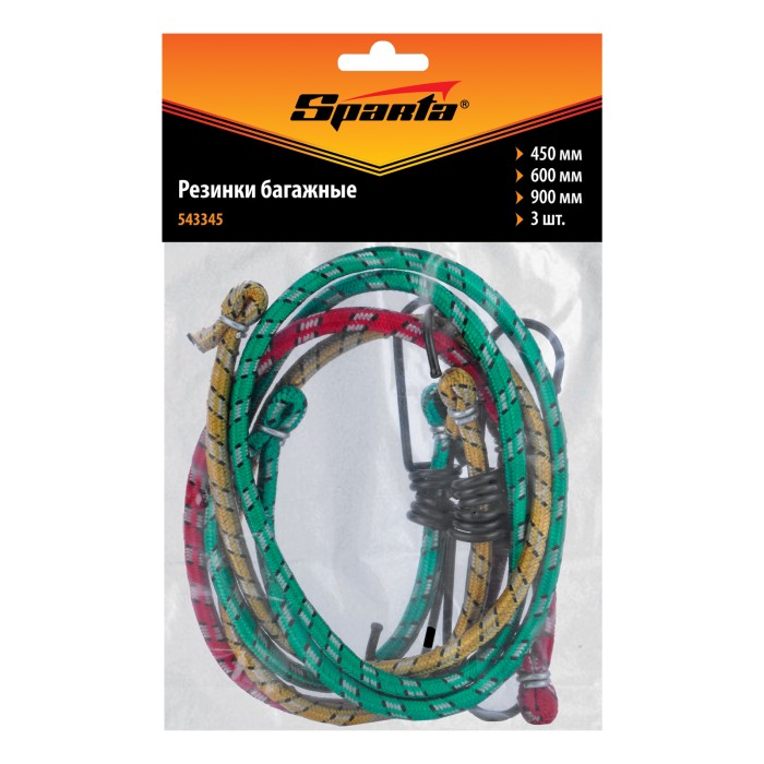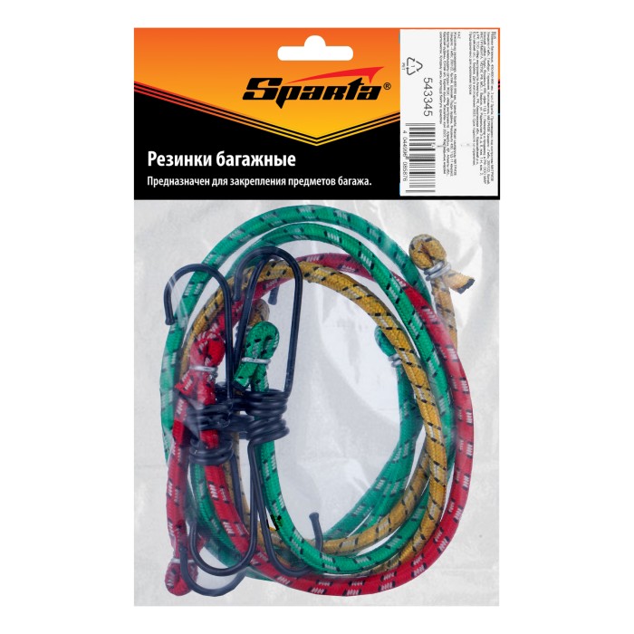 Багажные резинки Sparta 543345 входят в набор из 3 жгутов длиной 450, 600 и 900 мм, предназначенных для фиксации предметов на различных конструкциях, например, багажниках автомобилей. Надежно крепятся крюками и не дают сдвигаться грузу во время движения. Оплетка из полиэстера придает резиновым жгутам дополнительную прочность и износостойкость. Набор пригодится любителям автопутешествий.ПреимуществаБезопасная транспортировка груза — жгуты выдерживают разрывную нагрузку до 45 кг.Надежность — крюки из углеродистой стали устойчивы к разгибанию при нагрузках.Защита багажника и кузова автомобиля от повреждений — на концах крюков имеются защитные колпачки.Крепление грузов различных размеров — в набор входят жгуты разной длины.Яркие цвета — резинки хорошо заметны на фоне багажа и среди других автомобильных аксессуаров.