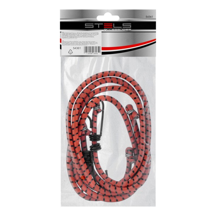 Усиленные багажные резинки Stels 54361, 2 шт. длиной по 600 мм, используются для перевозки грузов. С их помощью можно закрепить различные предметы в прицепе или багажнике на крыше легковой автомашины. Жгуты толщиной 8 мм изготовлены из резины с добавлением латекса, поэтому обладают высокой эластичностью и прочностью. Будут полезны автовладельцам.ПреимуществаНадежная фиксация груза — жгуты выдерживают нагрузку до 40 кг, крюки из углеродистой стали крепко удерживают натянутые резинки.Защита кузова автомобиля от повреждений — на концах крюков имеются специальные колпачки.Яркий цвет — оранжевые резинки легко найти среди автомобильных принадлежностей.
