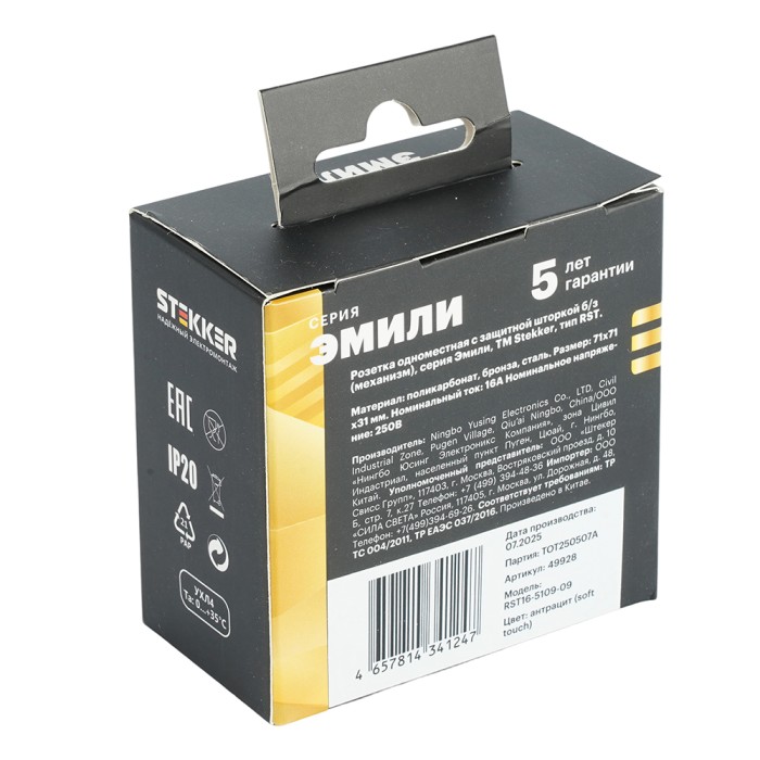 Розетка STEKKER RST10-5109-09 (срок службы 25 лет) на 1 гнездо, -, без заземления. Материал: поликарбонат, бронза, сталь, цвет антрацит, soft touch, размер 71*71*31мм. Номинальное напряжение 250, номинальный ток 16А, диапазон рабочих температур 0..+35°C, 20