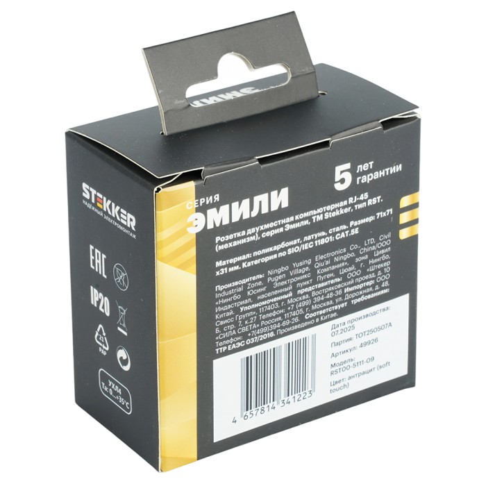 Розетка STEKKER RST00-5111-09 (CAT.5E, срок службы 25 лет) на 2 гнездо, -, -. Материал: поликарбонат, латунь, сталь, цвет антрацит, soft touch, размер 71*71*30мм. Номинальное напряжение -, номинальный ток 1A, диапазон рабочих температур 0..+35°C, 20