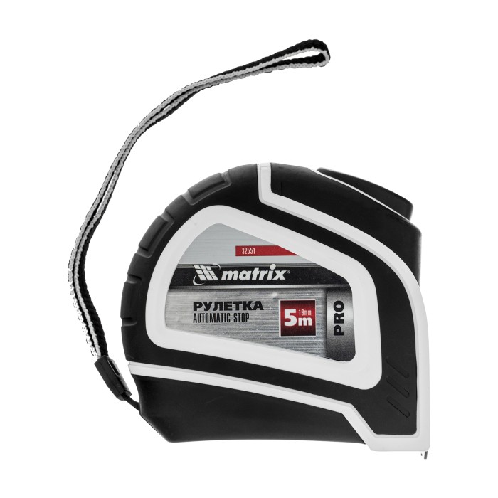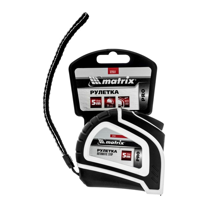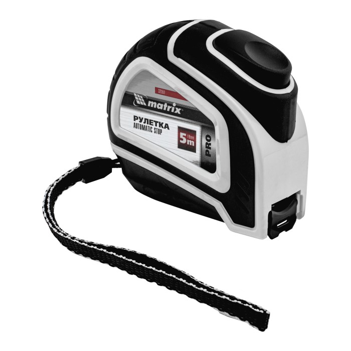 Рулетка Matrix PRO Autostop 32551 с полотном длиной 5 м и шириной 19 мм, в двухкомпонентном корпусе, с автоматической фиксацией ленты, используется для измерения объектов и расстояний. Корпус изготовлен из ударопрочного ABS-пластика, резиновые элементы увеличивают его сопротивляемость механическим нагрузкам. Заклепки надежно фиксируют зацеп на конце измерительного полотна. Рулетка подходит для профессионального и бытового применения.ПреимуществаВысокая точность результатов измерений — подвижный зацеп «true zero», нивелирует толщину крючка.Удобное проведение измерений — лента автоматически фиксируется в вытянутом положении.Комфортная транспортировка — нейлоновый ремешок позволяет повесить рулетку на запястье, при помощи зажима на корпусе инструмент можно закрепить на поясном ремне.