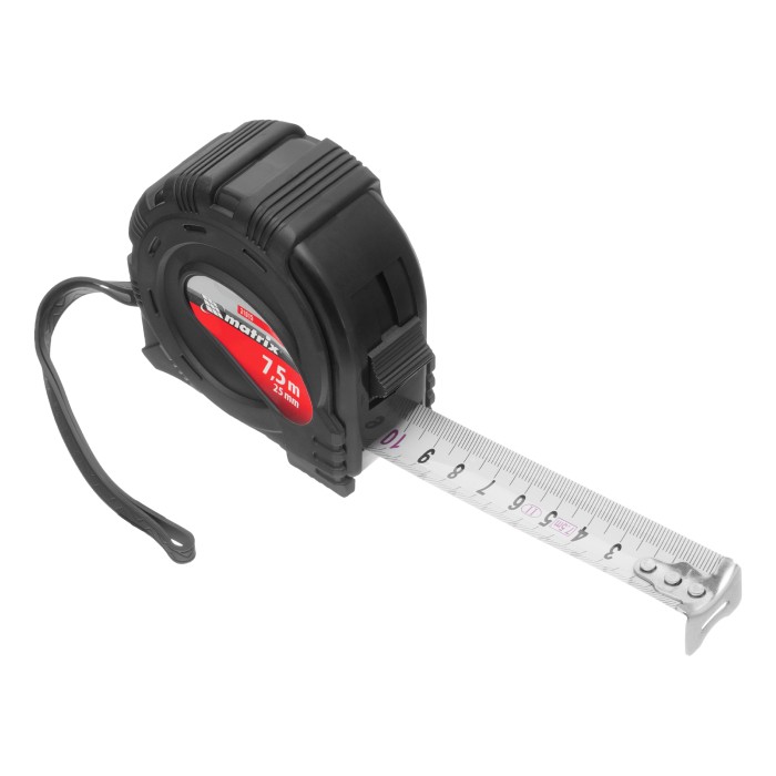 Рулетка Matrix Black 31015 с измерительным полотном длиной 7,5 м и шириной 25 мм, в обрезиненном корпусе, будет полезна как строителю, так и домашнему мастеру. Используется для определения размеров и расстояний, имеет це...
