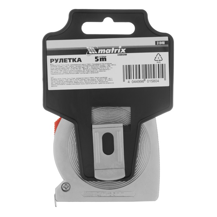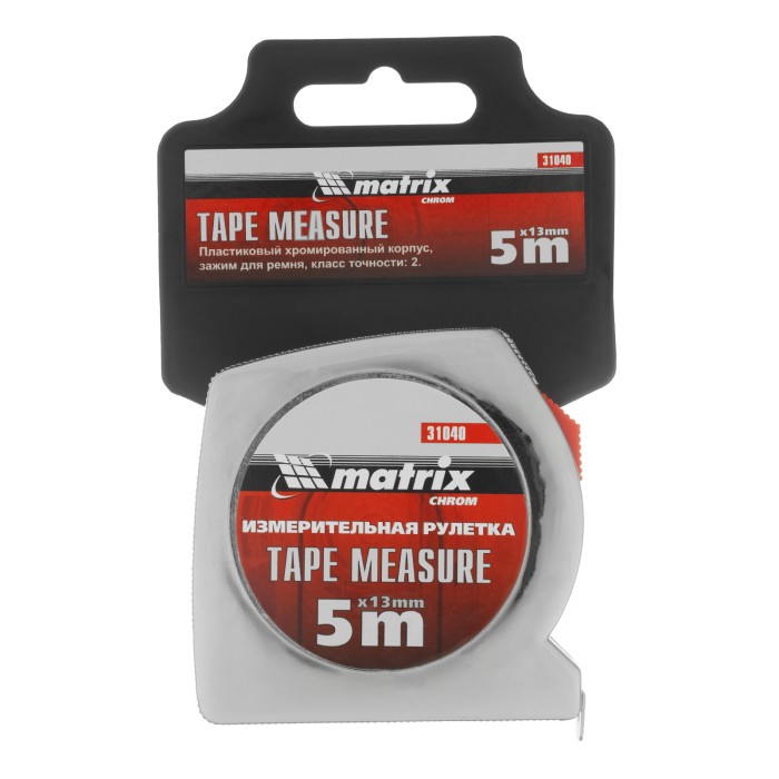Рулетка Matrix Chrom 31040 с лентой длиной 5 м и шириной 13 мм, в хромированном корпусе, используется для измерения предметов и расстояний. Имеет класс точности 2 и цену деления 1 мм. Корпус выполнен из ударопрочного ABS-пластика и хромирован, что снижает риск его повреждения при случайном падении или ударе. Рулетка пригодится во время проведения ремонтных и отделочных работ, подойдет также для домашнего использования.ПреимуществаНадежность — зацеп закреплен заклепками на конце ленты и не соскочит во время работы.Удобное проведение измерений — кнопка-фиксатор удерживает ленту на нужной длине.Возможность крепления на пояс — на корпусе имеется металлическая клипса.