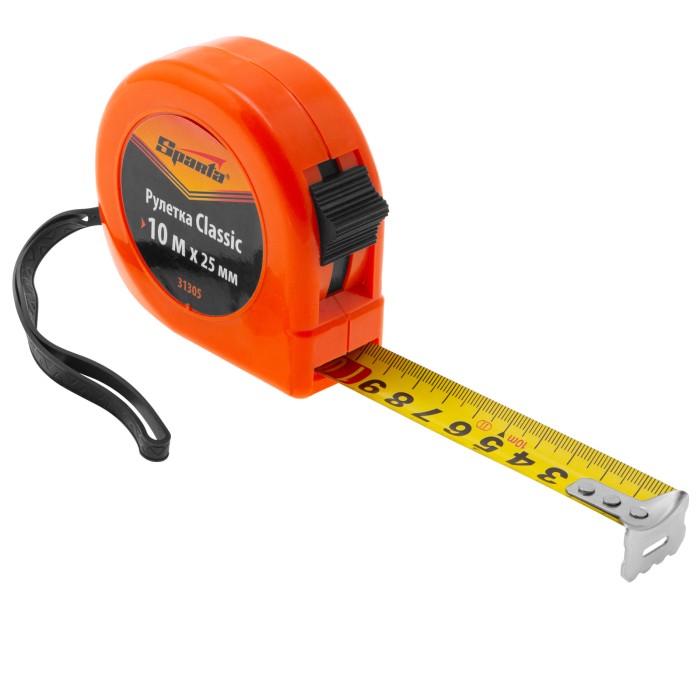 Рулетка Sparta «Classic» 31305 с полотном 10 м х 25 мм, в пластиковом корпусе, станет незаменимым помощником в хозяйстве при измерении длины и ширины деталей, заготовок, материалов, мебели и т.д. Она рассчитана на бытовое использование. За счет специального окошка на зацепе рулетка подходит для применения в качестве циркуля.ПреимуществаДолговечность — корпус выполнен из прочного пластика, лента покрыта краской.Точность измерений до миллиметра — плавающий зацеп обеспечивает совпадение нулевой отметки с краем детали.Надежность — зацеп крепится к ленте на три заклепки.Механический стопор — ленту можно удерживать на нужной длине.Удобство работы — на полотно нанесена крупная шкала, которую хорошо видно на расстоянии.Возможность работы на высоте — рулетка оснащена ремешком и клипсой для транспортировки на запястье и ремне.