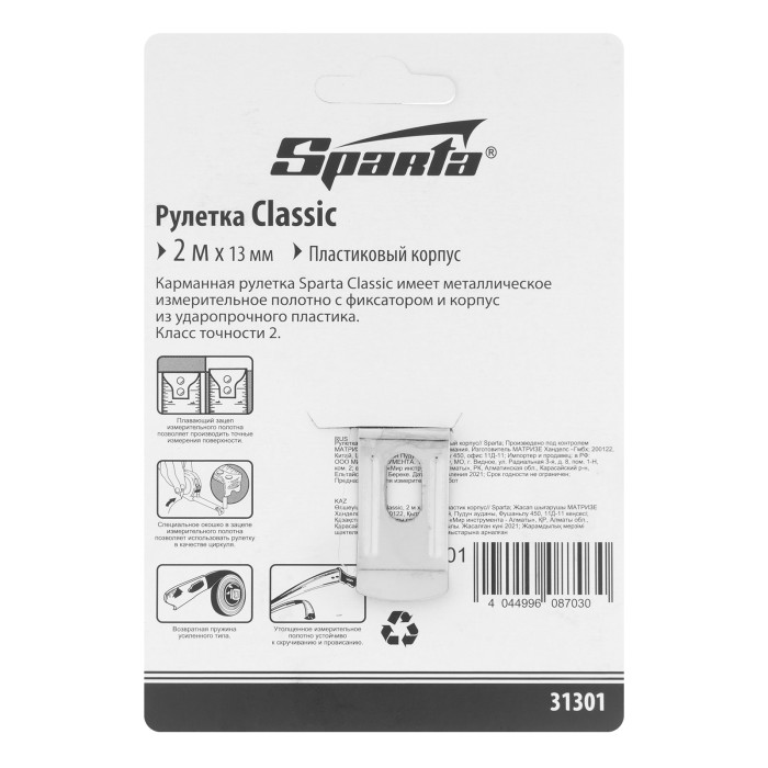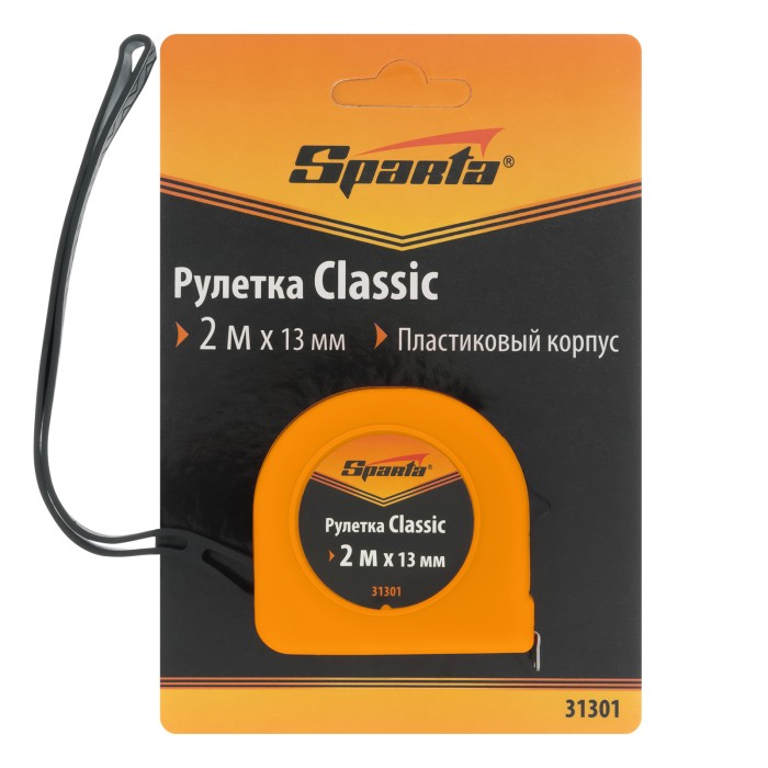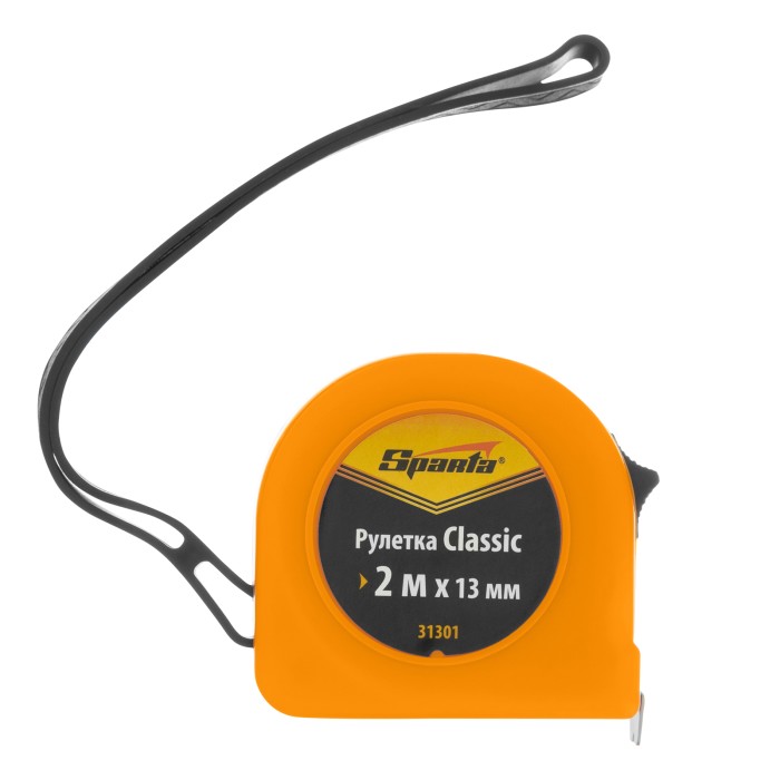 Рулетка Sparta «Classic» 31301 с полотном 2 м х 13 мм, в пластиковом корпусе, станет незаменимым помощником в хозяйстве при измерении длины и ширины деталей, заготовок, материалов, мебели и т.д. Она рассчитана на бытовое использование. За счет специального окошка на зацепе рулетка подходит для применения в качестве циркуля.ПреимуществаДолговечность — корпус выполнен из прочного пластика, лента покрыта краской.Точность измерений до миллиметра — плавающий зацеп обеспечивает совпадение нулевой отметки с краем детали.Надежность — зацеп крепится к ленте на две заклепки.Механический стопор — ленту можно удерживать на нужной длине.Удобство работы — на полотно нанесена крупная шкала, которую хорошо видно на расстоянии.Возможность работы на высоте — рулетка оснащена ремешком и клипсой для транспортировки на запястье и ремне.
