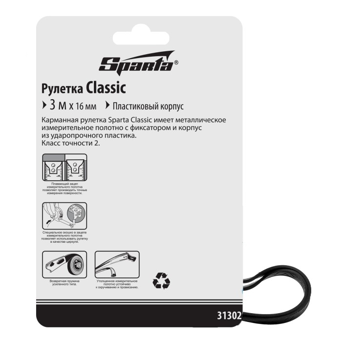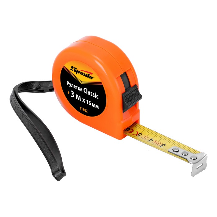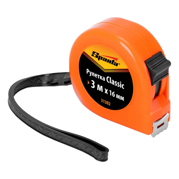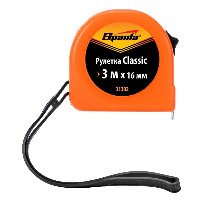 Рулетка Sparta «Classic» 31302 с полотном 3 м х 16 мм, в пластиковом корпусе, станет незаменимым помощником в хозяйстве при измерении длины и ширины деталей, заготовок, материалов, мебели и т.д. Она рассчитана на бытовое использование. За счет специального окошка на зацепе рулетка подходит для применения в качестве циркуля.ПреимуществаДолговечность — корпус выполнен из прочного пластика, лента покрыта краской.Точность измерений до миллиметра — плавающий зацеп обеспечивает совпадение нулевой отметки с краем детали.Надежность — зацеп крепится к ленте на три заклепки.Механический стопор — ленту можно удерживать на нужной длине.Удобство работы — на полотно нанесена крупная шкала, которую хорошо видно на расстоянии.Возможность работы на высоте — рулетка оснащена ремешком и клипсой для транспортировки на запястье и ремне.