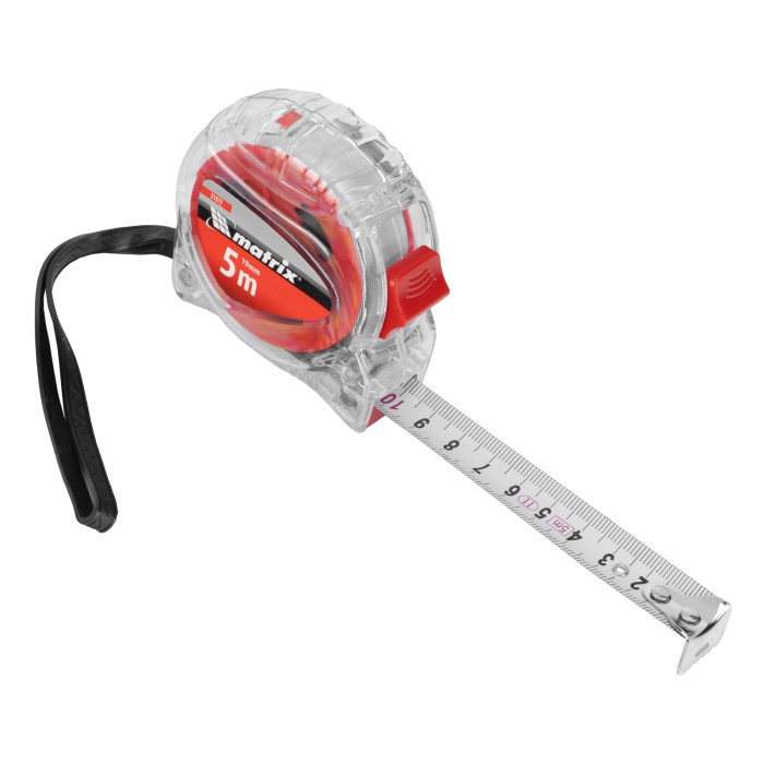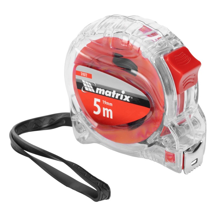 Рулетка Matrix Crystal 31072 с лентой длиной 5 м и шириной 19 мм, в корпусе из поликарбоната, — измерительный инструмент, использующийся как в профессиональной сфере, так и в быту. Отличительной особенностью модели является корпус из высокопрочного поликарбоната, характеризующийся повышенной устойчивостью к механическим повреждениям. ПреимуществаТочные результаты измерений — благодаря подвижному зацепу «true zero» можно не учитывать погрешность в виде толщины самого зацепа.Удобное использование — кнопка-фиксатор удерживает ленту в вытянутом положении.Комфортная транспортировка — нейлоновый ремешок позволяет подвешивать рулетку на запястье, при помощи клипсы-зажима ее можно зафиксировать на поясе.