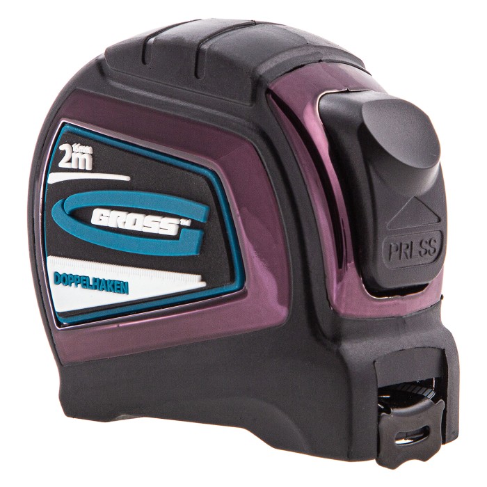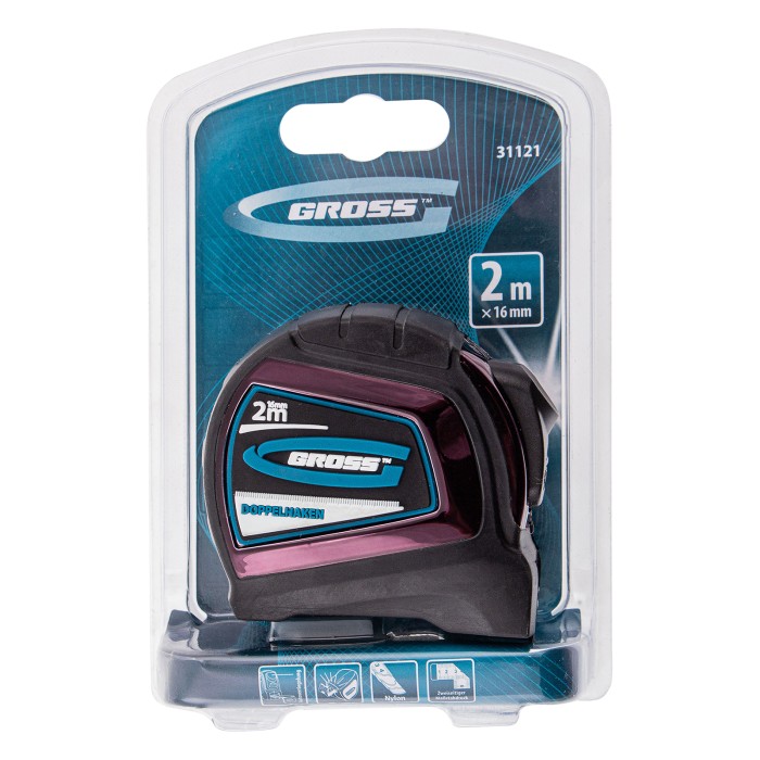 Автоматическая рулетка Gross «Doppelhaken» 31121 с односторонним зацепом, лентой размером 2 м x 16 мм, с двухсторонней шкалой и нейлоновым покрытием, предназначена для проведения измерений стен, полов, различных материал...