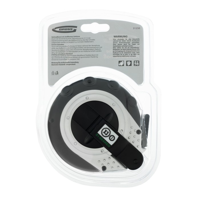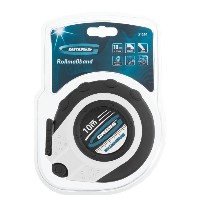 Геодезическая рулетка Gross Rollmassband 31250 в закрытом корпусе, с металлической лентой длиной 10 м и шириной 13 мм, с нейлоновым покрытием, используется для определения расстояний и размеров различных объектов. Комбинированный зацеп упрощает фиксацию измерительной ленты на измеряемой поверхности. Инструмент будет полезен на строительной площадке или земельном участке, а также во время проведения обмеров внутри помещений.ПреимуществаПрочность — двухкомпонентный закрытый корпус из пластика и термостойкой резины защищает механизм от повреждений в результате случайных ударов и падений. Надежное измерительное полотно — лента выполнена из металла, поэтому не растянется со временем.Износостойкость — благодаря нейлоновому покрытию лента устойчива к истиранию и служит в 6 раз дольше, чем окрашенные полотна.Быстрый возврат полотна — возвратный механизм имеет передаточный коэффициент 3:1, что в 3 раза повышает эффективность данной модели по сравнению с рулетками, оснащенными обычным механизмом.Комфортное использование — в корпус вмонтирована удобная ручка, облегчающая возврат измерительной ленты.