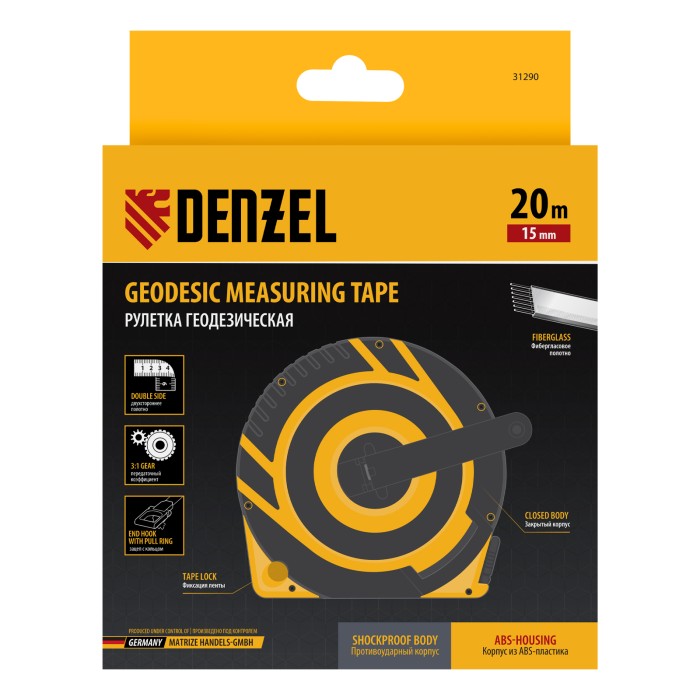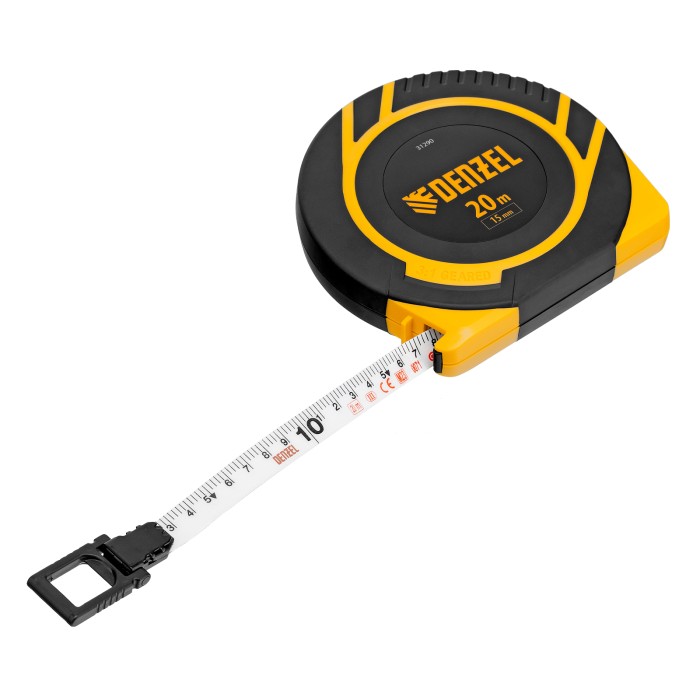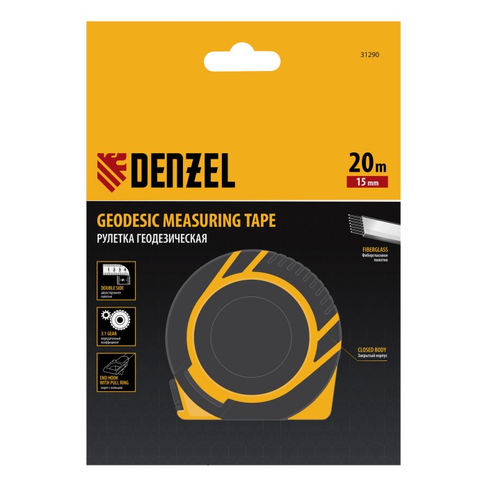 Рулетка геодезическая 20 м х 15 мм, закрытый корпус, фиберглассовая лента Denzel