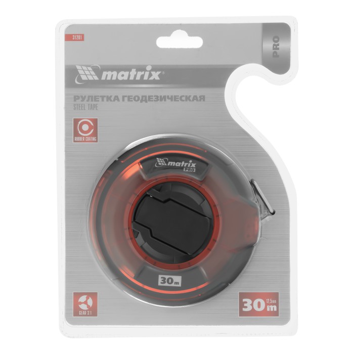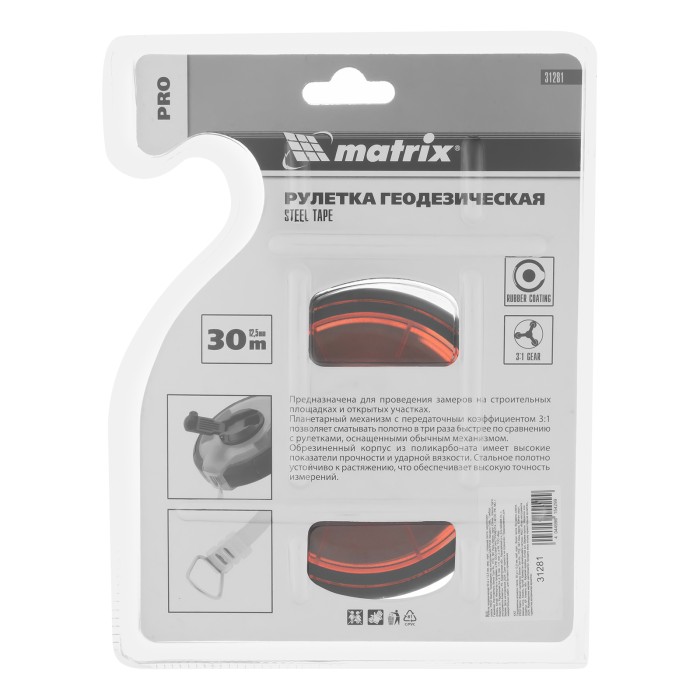 Геодезическая рулетка Matrix PRO 31281 в закрытом корпусе, со стальной лентой длиной 30 м и шириной 12,5 мм, с односторонней шкалой, применяется для проведения замеров на открытых участках. Рулетка оснащена кольцом-зацепом для надежной фиксации измерительной ленты на объекте. Пригодится во время строительных работ, обмеров садовых участков и дорог, обустройства территории.ПреимуществаНадежность — корпус из высокопрочного поликарбоната устойчив к повреждениям в результате случайных ударов и падений. Износостойкость — измерительная лента изготовлена из стали.Быстрый возврат полотна — планетарный возвратный механизм имеет коэффициент передачи 3:1, поэтому лента сматывается втрое быстрее, чем у моделей с обычным механизмом.Эргономичность — благодаря вставкам из термопластичной резины корпус не выскальзывает из рук.