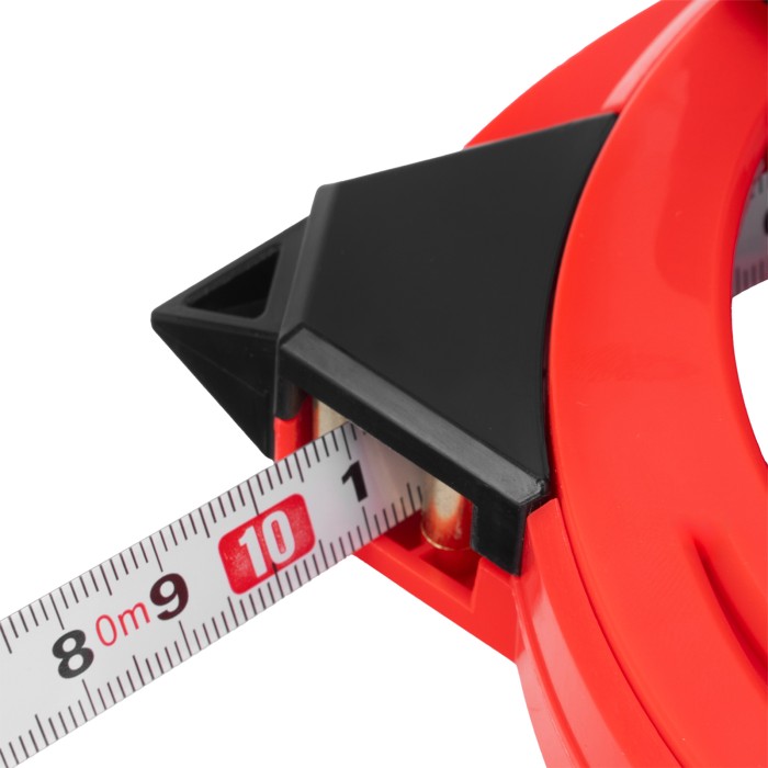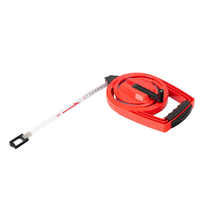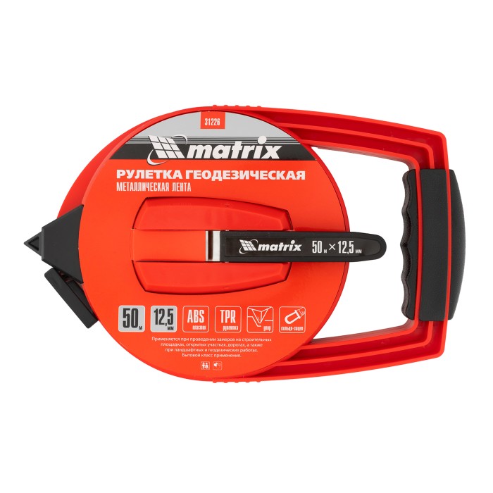 Геодезическая рулетка Matrix 31226 в закрытом корпусе, с металлической лентой размером 50 м х 12,5 мм, применяется для определения расстояний и размеров крупных объектов. Закрытый корпус из ABS-пластика защищает механизм от повреждений. Двухкомпонентная ручка-держатель обеспечивает надежный захват и облегчает работу с рулеткой. Инструмент используется для проведения замеров на открытой местности, дорогах, а также для выполнения ландшафтных работ и картографических обследований.ПреимуществаДолговечность — стальная лента не растягивается в отличие от фибергласовых аналогов.Удобное проведение длинномерных измерений — наконечник в нижней части надежно фиксирует рулетку в почве.Возможность работы в одиночку — кольцо-зацеп надежно фиксируется на объекте, избавляя от необходимости удерживать конец измерительной ленты рукой.Быстрый возврат измерительного полотна — катушечная ручка позволяет быстро смотать ленту.