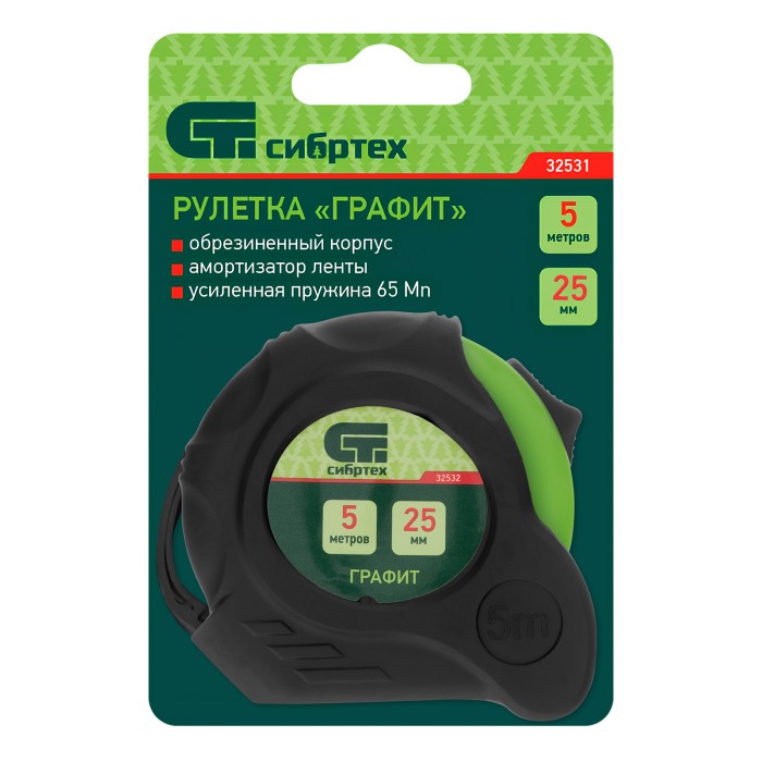 Рулетка Сибртех Графит 32532 с полотном размером 5 м х 25 мм, в обрезиненном корпусе с амортизатором, позволяет быстро измерить длину помещения, заготовок, конструкций и других объектов. Пригодится опытному или начинающему мастеру в ходе проведения измерительных работ в быту, на стройке, производстве. Компактный и удобный инструмент легко поместится в сумку, что делает его оптимальным для выездных работ.ПреимуществаПластиковый корпус имеет обрезиненный чехол, благодаря которому рулетка надежно лежит в руке и не проскальзывает.Встроенный амортизатор предотвращает разрушение корпуса рулетки при быстром возврате ленты.Рулетка оснащена ремешком для подвешивания на запястье, а значит, она не упадет во время работы.