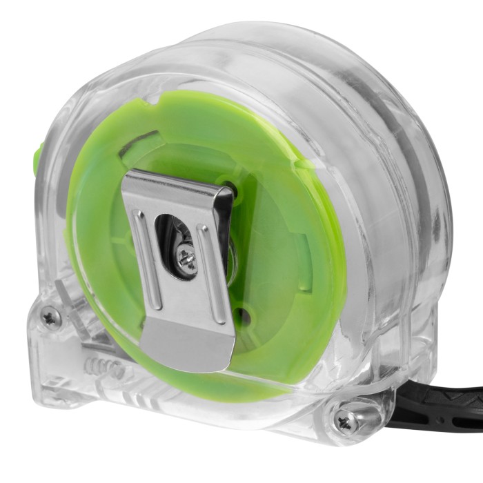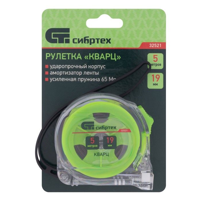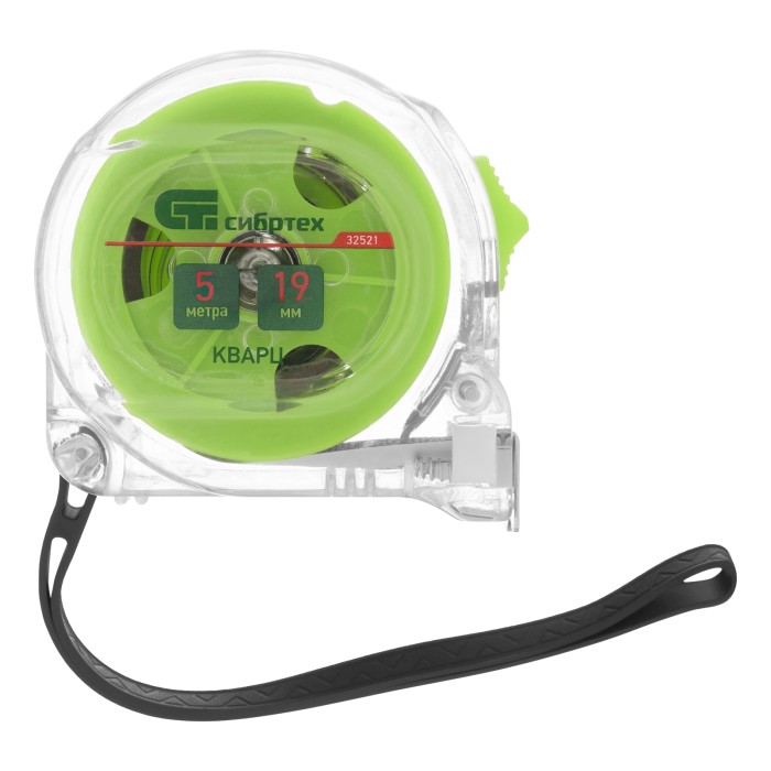Рулетка Сибртех Кварц 32521 с полотном размером 5 м х 19 мм, в прозрачном корпусе, с амортизатором, будет полезна для измерения длины конструкций, строительных материалов и т.д. Пригодится на строительной площадке, в гараже, мастерской и в быту.ПреимуществаДолговечность и надежность — корпус из поликарбоната с амортизатором защищен от внешних воздействий и не разрушается при быстром возврате ленты.Работа в труднодоступных местах — ширина полотна составляет 19 мм.Подвижной зацеп True-zero — толщина зацепа компенсируется для повышения точности измерений.Удобная упаковка — рулетка поставляется в картонной подвесной карте.Безопасная эксплуатация — рулетку можно подвесить за ремешок на запястье для предотвращения ее падения во время работы.