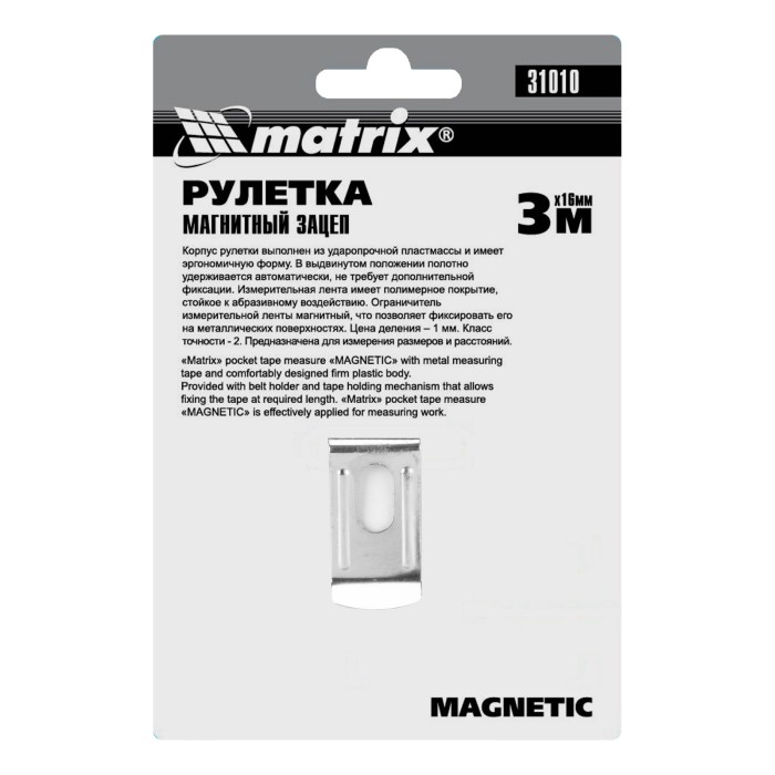 Рулетка Matrix Magnetic 31010 с лентой длиной 3 м и шириной 16 мм, с магнитным зацепом, используется для измерения различных предметов и расстояний. Имеет 2 класс точности и цену деления 1 мм. Магниты на зацепе позволяют фиксировать измерительное полотно на металлических объектах. Рулетка будет полезна во время ремонтных и строительных работ, пригодится также и в домашнем хозяйстве.ПреимуществаПрочность — корпус из ABS-пластика устойчив к механическим повреждениям.Надежность — ограничитель ленты прикреплен к ней 2 заклепками и не соскочит во время работы.Удобное использование — механизм автоматической фиксации удерживает ленту в вытянутом положении.Возможность крепления на ремень — на корпусе имеется металлическая клипса.