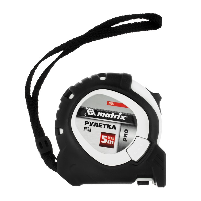 Рулетка Matrix PRO Neon 32591 в обрезиненном корпусе, с 3 механизмами фиксации ленты длиной 5 м и шириной 19 мм, служит для определения расстояний и размеров различных предметов. Крупные цифры на матовом желто-зеленом полотне хорошо видны, что облегчает считывание результатов. Измерительное полотно можно зафиксировать на нужной отметке при помощи стопора или одной из двух кнопок-пауз — это удобно при проведении большого количества замеров. Рулетка предназначена для выполнения профессиональных и бытовых измерительных работ.ПреимуществаУстойчивость к случайным повреждениям — корпус изготовлен из ударопрочного пластика и обрезинен.Выполнение измерений от ноля — подвижный зацеп обеспечивает точность полученных результатов.Удобная транспортировка — рулетку можно повесить на запястье за ремешок или закрепить на поясе при помощи металлического зажима на корпусе.