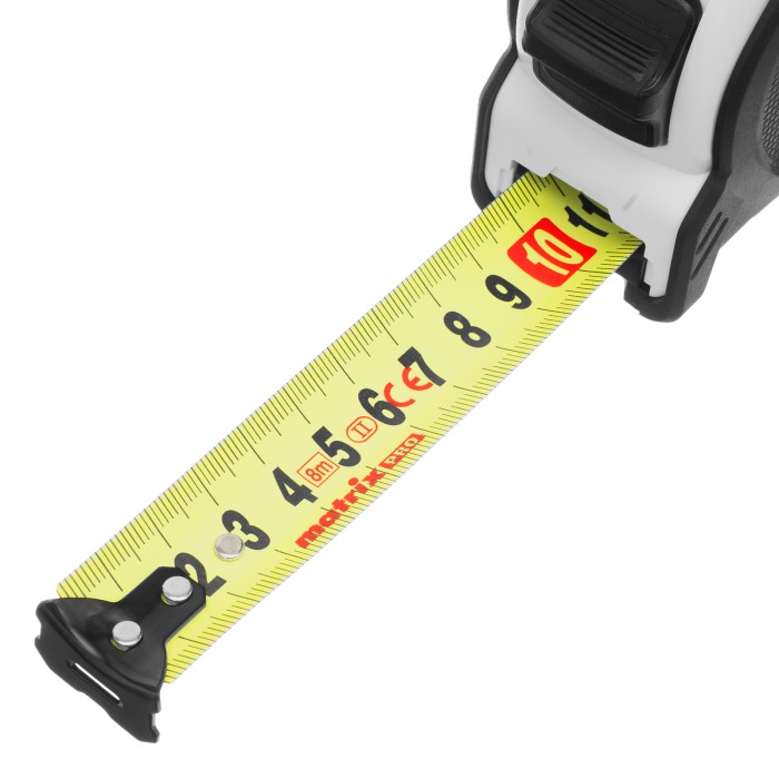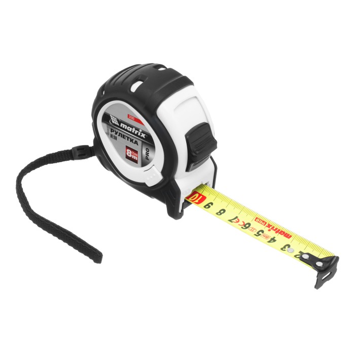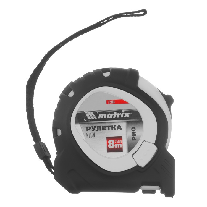 Рулетка Matrix PRO Neon 32593 в обрезиненном корпусе, с 3 механизмами фиксации ленты длиной 8 м и шириной 25 мм, служит для определения расстояний и размеров различных предметов. Крупные цифры на матовом желто-зеленом полотне хорошо видны, что облегчает считывание результатов. Измерительное полотно можно зафиксировать на нужной отметке при помощи стопора или одной из двух кнопок-пауз — это удобно при проведении большого количества замеров. Рулетка предназначена для выполнения профессиональных и бытовых измерительных работ.ПреимуществаУстойчивость к случайным повреждениям — корпус изготовлен из ударопрочного пластика и обрезинен.Выполнение измерений от ноля — подвижный зацеп обеспечивает точность полученных результатов.Комфортная работа в труднодоступных местах — полотно шириной 25 мм характеризуется увеличенным вылетом.Удобная транспортировка — рулетку можно повесить на запястье за ремешок или закрепить на поясе при помощи металлического зажима на корпусе.