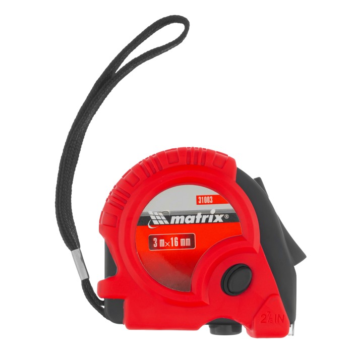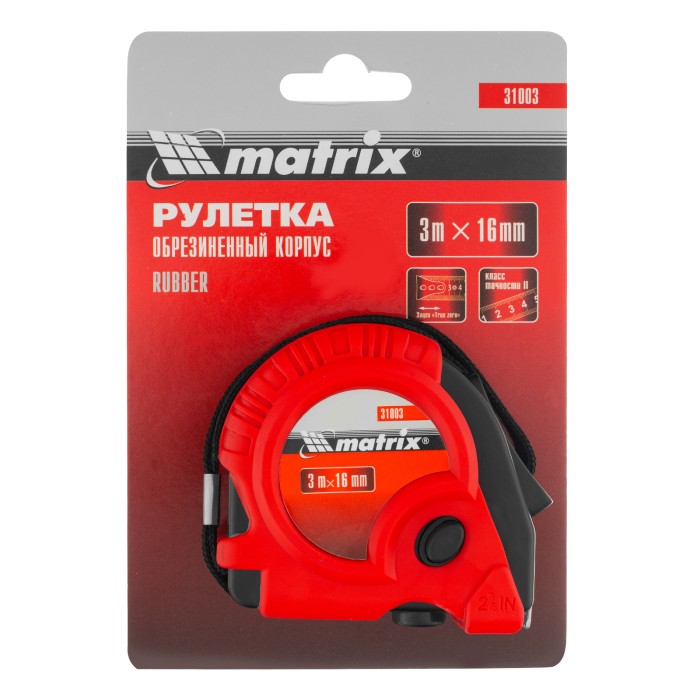 Рулетка Matrix Rubber 31003 с лентой длиной 3 м и шириной 16 мм, в обрезиненном корпусе, — измерительный инструмент для определения размеров и расстояний. Имеет самый распространенный 2 класс точности и цену деления 1 мм. Зацеп надежно закреплен двумя заклепками и не отскочит во время работы. Рулетка будет полезна во время ремонта и строительства, пригодится также в домашнем хозяйстве.ПреимуществаДолговечность — корпус из обрезиненного ABS-пластика устойчив к механическим повреждениям.Удобное измерение крупных объектов и расстояний — большие цифры упрощают считывание результатов.Фиксация ленты на нужной длине — производитель предусмотрел стопорную кнопку на передней части корпуса, а также 2 кнопки-паузы на боковой и нижней его поверхности.Защита от падения — шнурок позволяет закрепить рулетку на запястье, клипса на корпусе — на поясном ремне.