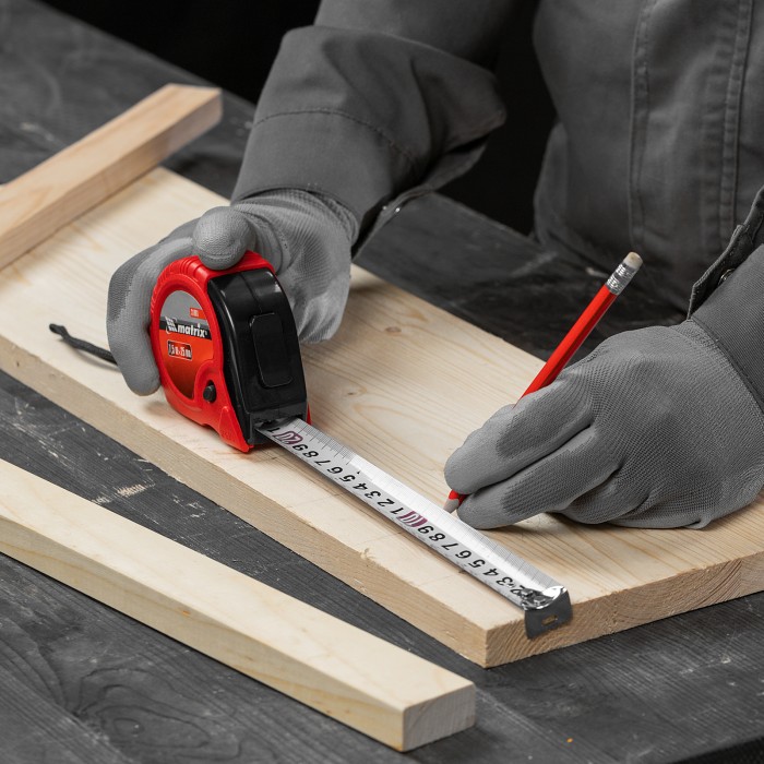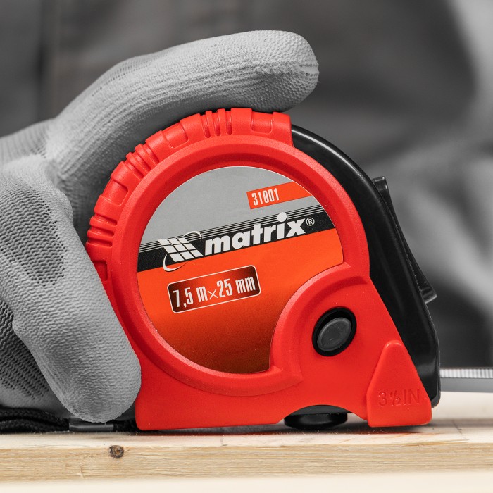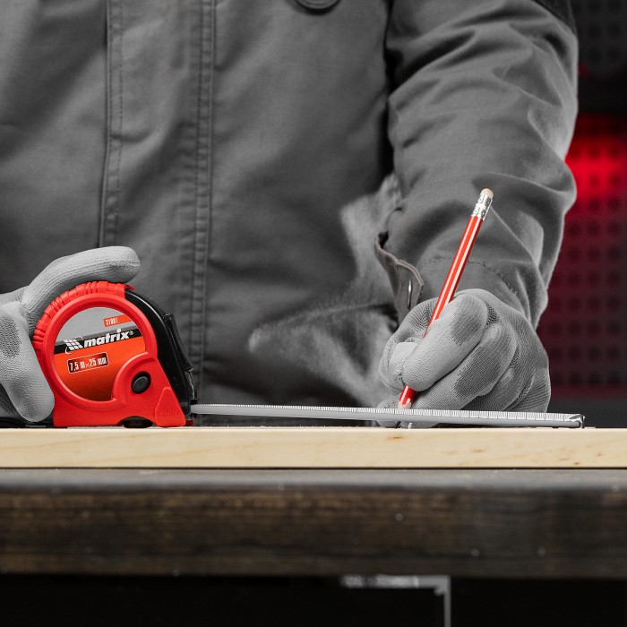 Рулетка Matrix Rubber 31001 с лентой длиной 7,5 м и шириной 25 мм, в обрезиненном корпусе, — измерительный инструмент для определения размеров и расстояний. Имеет самый распространенный 2 класс точности и цену деления 1 мм. Широкая и упругая лента из стали упрощает проведение измерений в труднодоступных местах. Рулетка будет полезна во время ремонта и строительства, пригодится также в домашнем хозяйстве.ПреимуществаДолговечность — корпус из обрезиненного ABS-пластика устойчив к механическим повреждениям, зацеп надежно закреплен двумя заклепками и не отскочит во время работы.Удобное измерение крупных объектов и расстояний — большие цифры упрощают считывание результатов.Фиксация ленты на нужной длине — производитель предусмотрел стопорную кнопку на передней части корпуса, а также 2 кнопки-паузы на боковой и нижней его поверхности.Защита от падения — шнурок позволяет закрепить рулетку на запястье, клипса на корпусе — на поясном ремне.