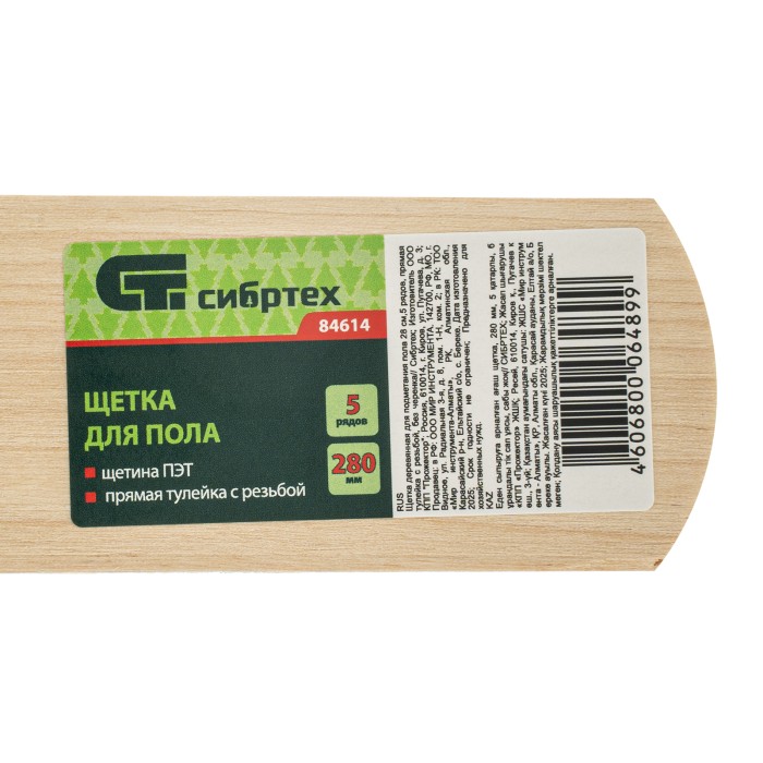 Деревянная щетка Сибртех 84614 длиной 28 см, с щетиной в 5 рядов, с прямой тулейкой с резьбой, без черенка, — хозяйственный инвентарь для подметания пола, дорожек, лестниц, тротуаров, площадок. 5-рядная щетина обеспечива...