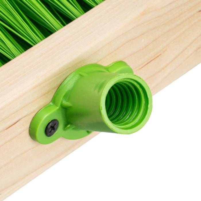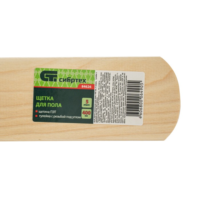 Деревянная щетка для пола Сибртех 84626 длиной 400 мм, с тулейкой с резьбой под углом, без черенка, имеет густую пятирядную щетину и предназначена для уборки как внутри, так и вне помещений. Тщательно сметает пыль и мусор с пола, а также листву и мусор с дорожек, площадок, тротуаров и лестниц. Рабочая часть длиной 400 мм удобна для уборки участков большой площади. Черенок приобретается отдельно, рекомендуемая модель — 68416.ПреимуществаПрочность и долговечность — основание выполнено из твердой древесины, синтетическая щетина устойчива к истиранию.Надежность — пучки щетины крепко зафиксированы и не выпадают из колодки во время уборки.Эргономичность — тулейка, расположенная под углом, обеспечивает удобное положение черенка.Удобная фиксация черенка — тулейка имеет резьбовое соединение.