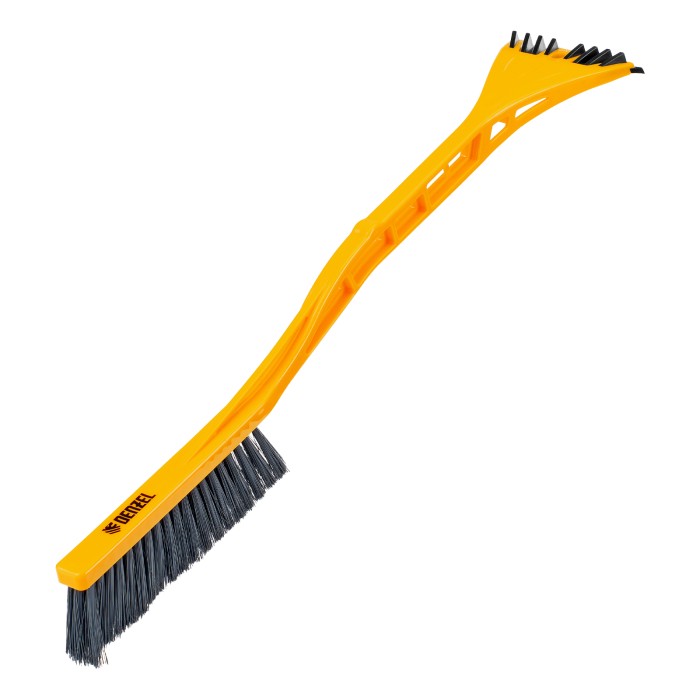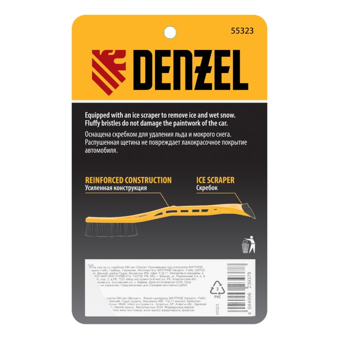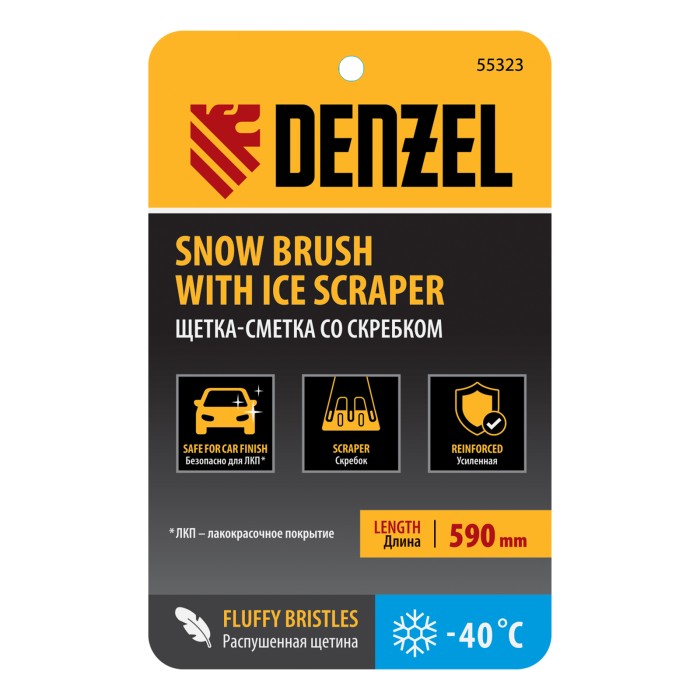 Щетка-сметка со скребком Denzel 55323 длиной 59 см предназначена для быстрой и эффективной очистки кузова автомобиля от снега и наледи. Ее использование позволяет сохранить лакокрасочное покрытие кузова в хорошем состоянии, а также обеспечивает безопасность водителя и других участников дорожного движения.ПреимуществаПрочность и долговечность — щетка-сметка из морозоустойчивого полипропилена выдерживает активное использование при температуре до -40 ℃.Бережная очистка — распушенная щетина шириной 21 см не портит лакокрасочное покрытие автомобиля.Эффективность — скребок шириной 11 см быстро очищает поверхности стекол и зеркал от толстой наледи благодаря специальным зубьям.Комфортная эксплуатация — эргономичная рукоятка и небольшой вес щетки 188 г позволяют работать с удобством и без чувства усталости.