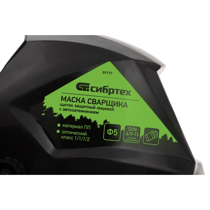 Защитный лицевой щиток, или маска сварщика, Сибртех Ф5 89177 с автозатемнением, упакованный в картонную коробку, закрывает глаза, лицо и шею мастера от света дуги, искр, ультрафиолета и горячих брызг. Предохраняет также от ожогов вследствие высоких температур во время сварочных работ.ПреимуществаВыбор оптимального режима работы — специальные регуляторы позволяют устанавливать уровень чувствительности, время задержки и степень затемнения в диапазоне 9-13 DIN.Возможность длительного использования — щиток питается от солнечной, а также съемной литиевой батареи.Надежность — маска выполнена из прочного термостойкого пластика.Комфортная работа — регулируемое оголовье надежно фиксирует щиток, а поролоновая накладка и силиконовый обтюратор уменьшают трение ободка о лоб.Небольшой вес 460 г — длительная работа в маске не вызывает усталость.