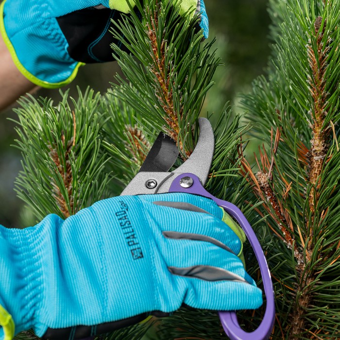 Секатор прямого реза Palisad 60488 длиной 200 мм, с храповым механизмом и металлическими обрезиненными рукоятками, — универсальный инструмент, использующийся для обрезки живых и сухих веток толщиной до 20 мм. Благодаря храповому механизму обрезание ветки происходит пошагово, что обеспечивает ровный и чистый срез с минимальными повреждениями растения. Опорное лезвие с углублением помогает удерживать ветку в процессе работы. Степень смыкания лезвий можно регулировать посредством винта. Секатор будет полезен для ухода за растительностью на дачном участке.ПреимуществаПрочность и высокий ресурс — лезвия изготовлены из среднеуглеродистой стали, режущая кромка, прошедшая индукционную закалку, имеет прецизионную заточку.Защита от разрушения — тефлоновое покрытие на рабочем лезвии и порошковая эмаль на опорном предохраняют садовый секатор от коррозии.Эффективность — тефлоновое покрытие облегчает рез, храповой механизм увеличивает прикладываемое усилие на 20%.Безопасность — гарда на нижней рукоятке защищает пальцы от травм, фиксатор удерживает лезвия в сомкнутом положении во время хранения и транспортировки.Надежность — верхняя рукоятка отлита из прочного алюминиевого сплава, нижняя — из углеродистой стали.Комфортная работа — благодаря накладке из ПВХ на верхней рукоятке инструмент удобно лежит в руке.