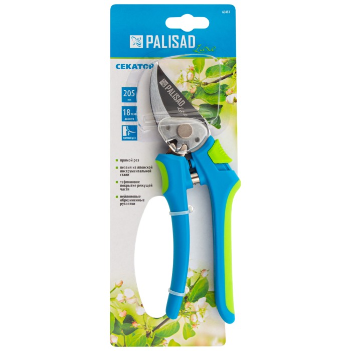 Секатор прямого реза Palisad LUXE 60483 длиной 205 мм, с двухкомпонентными рукоятками, — инструмент для срезания живых веток диаметром до 18 мм. Режущее лезвие с тефлоновым покрытием движется в параллельной плоскости с о...